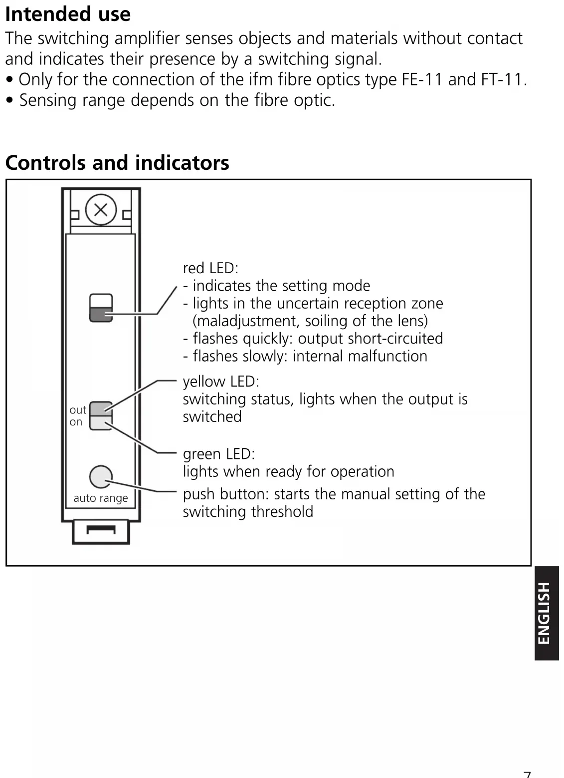 - Sensing range depends on the fibre optic. Controls and indicators