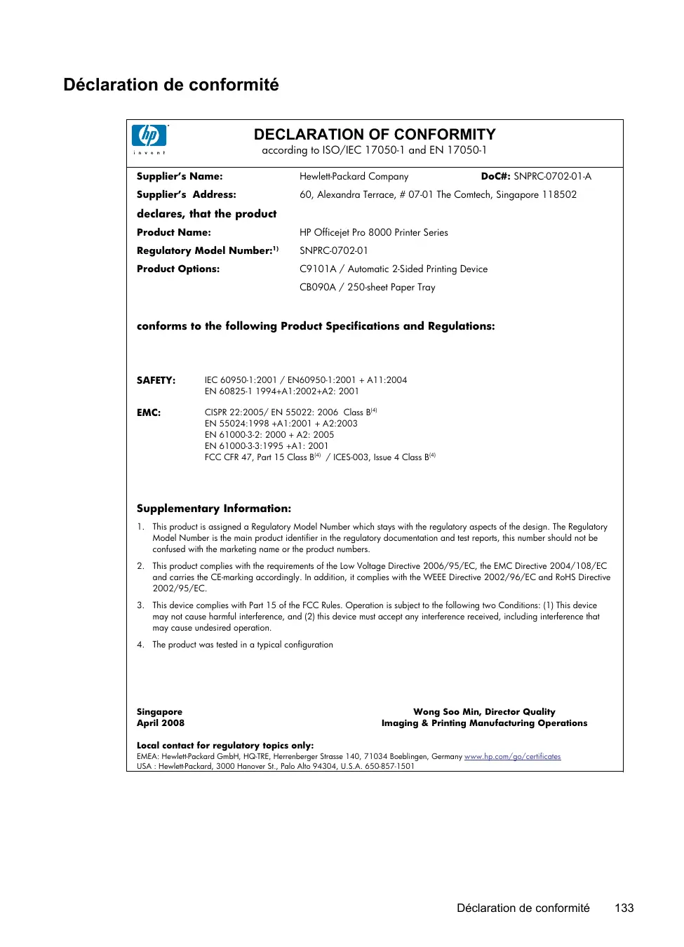 Singapore April 2008 Wong Soo Min, Director Quality Imaging & Printing Manufacturing Operations Local contact for regulatory topics only: EMEA: Hewlett-Packard GmbH, HQ-TRE, Herrenberger Strasse 140, 71034 Boeblingen, Germany www.hp.com/go/certificates USA : Hewlett-Packard, 3000 Hanover St., Palo Alto 94304, U.S.A. 650-857-1501 Déclaration de conformité