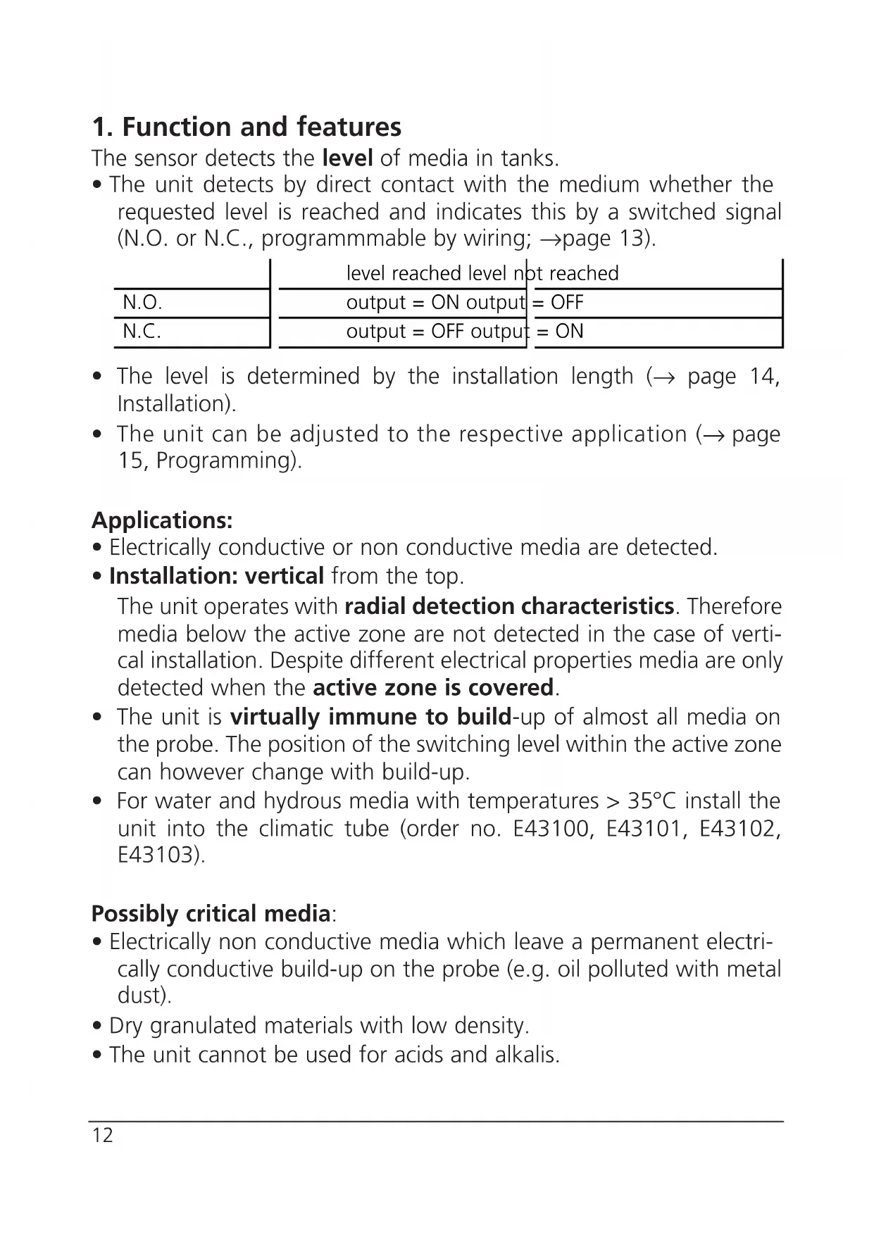 - The unit detects by direct contact with the medium whether the requested level is reached and indicates this by a switched signal (N.O. or N.C., programmmable by wiring; → page 13).
