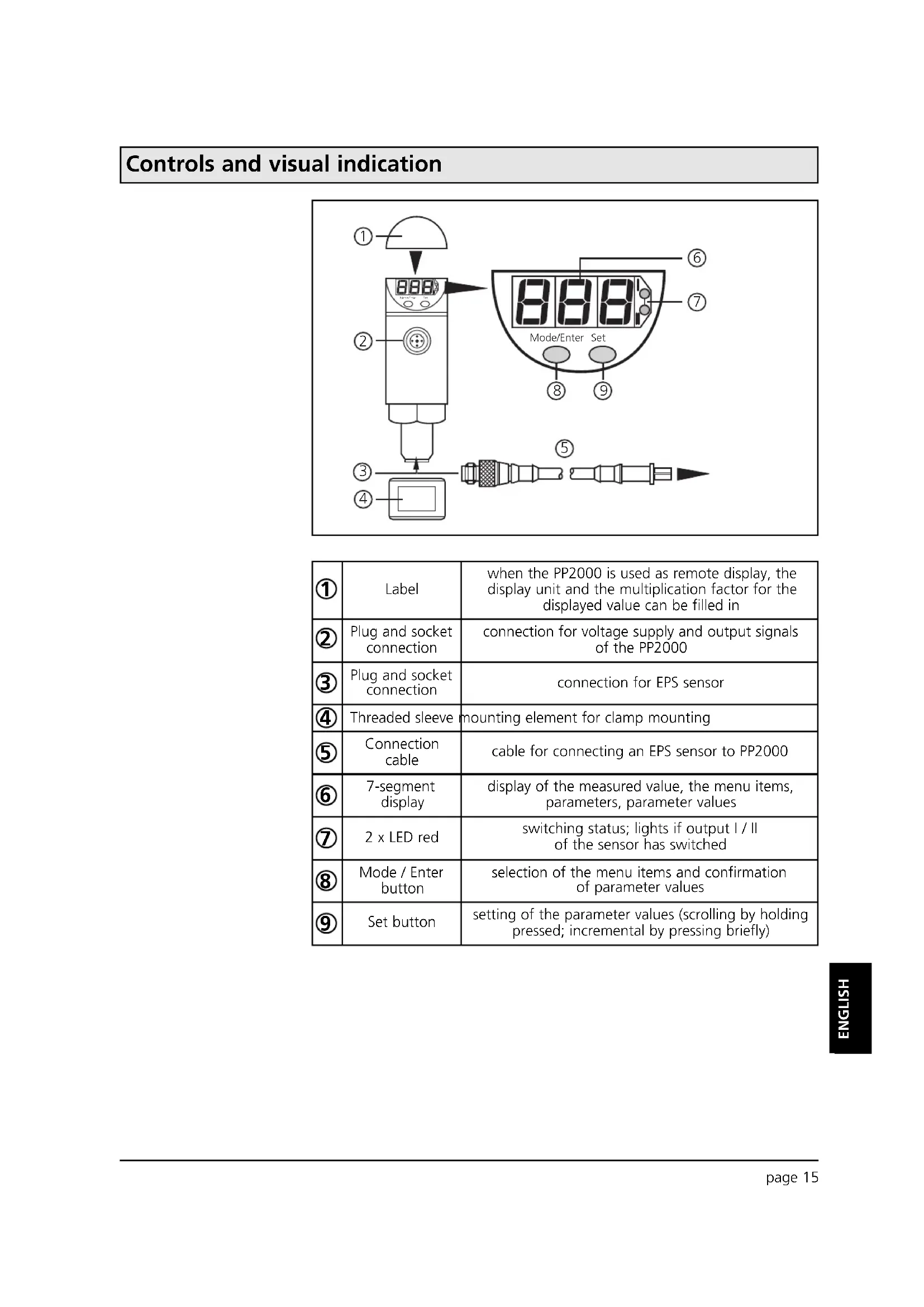 Press Set button: set parameter value, carry out action Press Mode/Enter button: confirm settingAfter connection of a sensor the parameters of the sensor are loaded into the working memory of the PP2000. The parameters of the sensor remain stored in the working memory of the PP2000 even if the voltage supply is interrupted. They are only overwritten if a new sensor is connected. By storing (Sto), the parameters of the sensor are stored in the select- ed read-only memory (nr1, nr2 or nr3) of the PP2000. page 19 ENGLISH Copying and storing sensor parameters