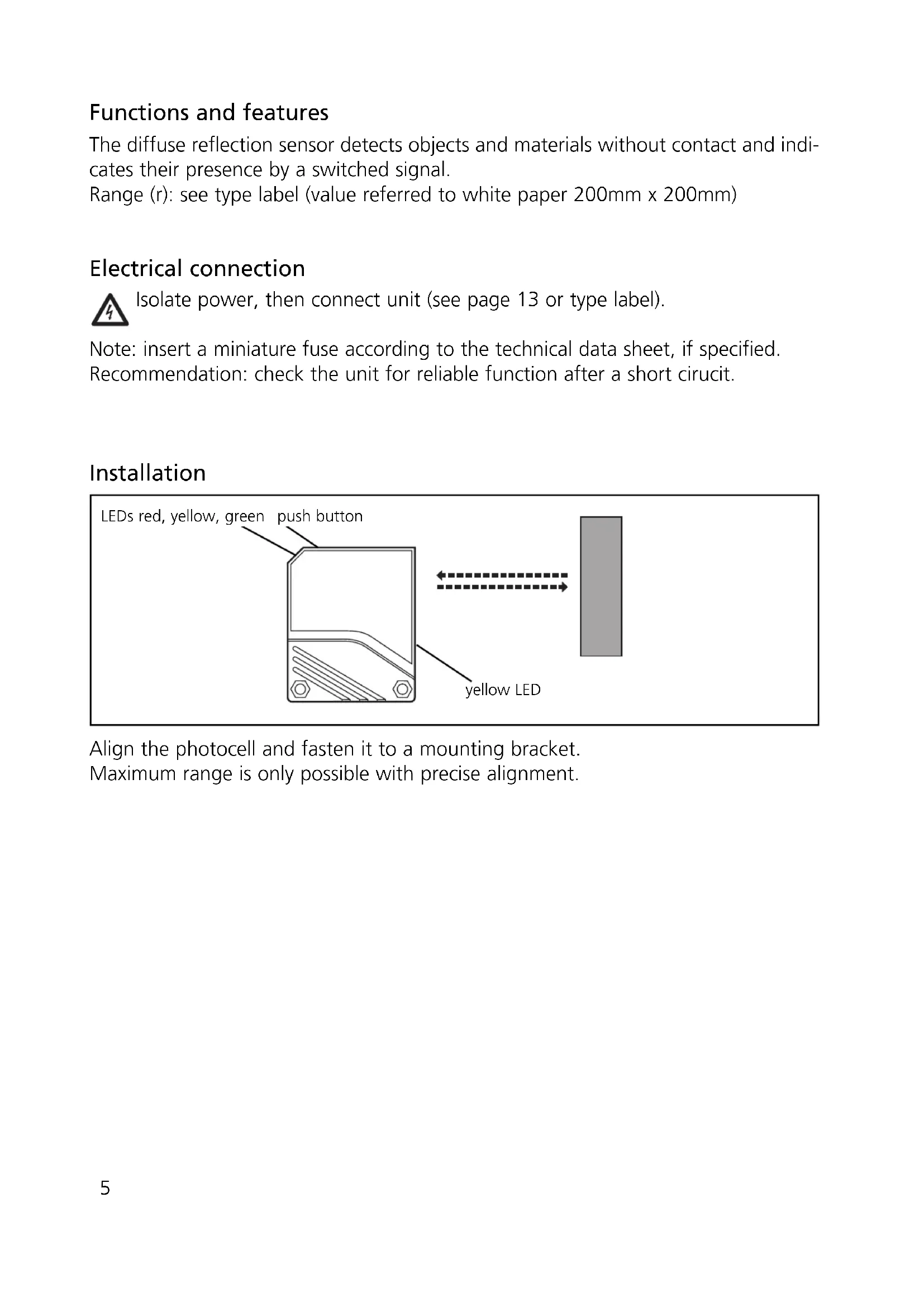 Press once. Remove the object * The yellow and green LED’s go out for approx. 1 s, then flash again alternately. The yellow and green LED’s go out for approx. 1s, then the green LED is on (= unit is in operating mode). 7Programming the output function Operation Check the safe functioning of the diffuse reflection sensor. Display by LED’s. Maintenance Keep the plastic lenses of the sensor free from soiling. For cleaning do not use any solvents or cleaning agents which could damage the plastic lenses.