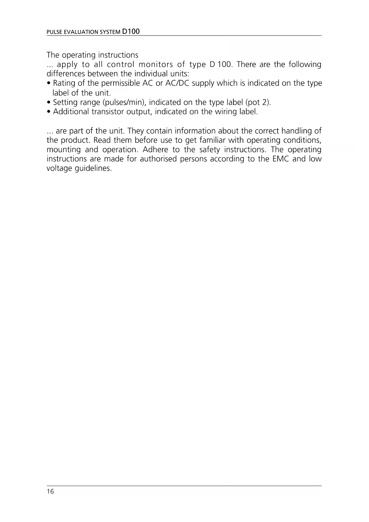 D100 Power supply (AC or DC) DC supply for all units: 24 Volt DC ± 10%, at the terminals 6 (-) and 7(+). An external DC voltage supply must meet the SELV requirements. For this supply voltage the unit is classified in protection class 3. Current consumption max. 70mA. For AC units with transformer power supply: According to the type label AC voltage ± 10% at the terminals 15 (L1) and 16 (N), frequency range 50 ... 60 Hz. For this supply the unit is classified in protection class 2 except for the terminal blocks. The protective low voltage generated within the unit for the monitor supply and pulse pick-up supply meets the SELV criteria according to overvoltage category 2 and soiling degree 2. Power consumption max. 5 VA. For units with AC/DC switched-mode power supply: According to the type label AC voltage ± 10% at the terminals 15 and 16, frequency range 50 ... 60 Hz. For this supply the unit is classified in protection class 2 except for the terminal blocks. The protective low voltage generated within the unit for the monitor supply and pulse pick-up supply meets the SELV criteria according to overvoltage category 2 and soiling degree 2. Power consumption max. 5 VA. Inputs Terminal 4 for pnp switching 24 V DC pulse pick-ups. Current consumption: approx. 10 mA. Switch point for pnp pulse pick-up: ≥ 14 V ON;< 7 V OFF The maximum input frequency to be detected is 250 Hz (corresponds to 15 000 pulses/min). Pulse pick-up supply Voltage: typ. 24 V DC; current rating: max. 30 mA, protected against short circuit and over- load. For external DC supply of the unit via the terminals 6 and 7 the supply voltage of the pulse pick-up corresponds to the DC supply voltage, less a low voltage for the short-circuit protec- tion. For external supply of the unit via the transformer or switched-mode power supply (terminals 15 and 16) the supply voltage of the pulse pick-up corresponds to the rectified non-stabilised output DC voltage of the internal transformer (nominal 24 V). Outputs Output relay Switching capacity: max. 250V AC, 8 A. The current has to be limited to these values by appropriate external measures. For inductive loads the relays must be subjected to external interference suppression. The relay contacts are safely separated from the supply voltages of the unit, from the sensor and contacts of the second relay, if there is any, up to a rated voltage of 250 V AC. They conform to the overvoltage category 2 and soiling degree 2. NOTE: If the relay is used to switch very low currents (e.g. plc inputs), considerable contact resistance can arise. The life of the relay contacts is considerably reduced by excess current or by the switching of unprotected inductive loads.26