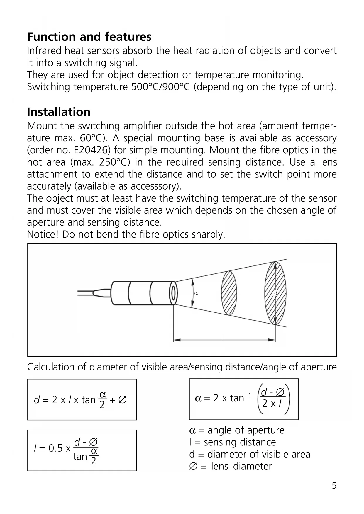 Function and features Infrared heat sensors absorb the heat radiation of objects and convert it into a switching signal. They are used for object detection or temperature monitoring. Switching temperature 500°C/900°C (depending on the type of unit). Installation Mount the switching amplifier outside the hot area (ambient temper- ature max. 60°C). A special mounting base is available as accessory (order no. E20426) for simple mounting. Mount the fibre optics in the hot area (max. 250°C) in the required sensing distance. Use a lens attachment to extend the distance and to set the switch point more accurately (available as accesssory). The object must at least have the switching temperature of the sensor and must cover the visible area which depends on the chosen angle of aperture and sensing distance. Notice! Do not bend the fibre optics sharply. Calculation of diameter of visible area/sensing distance/angle of aperture