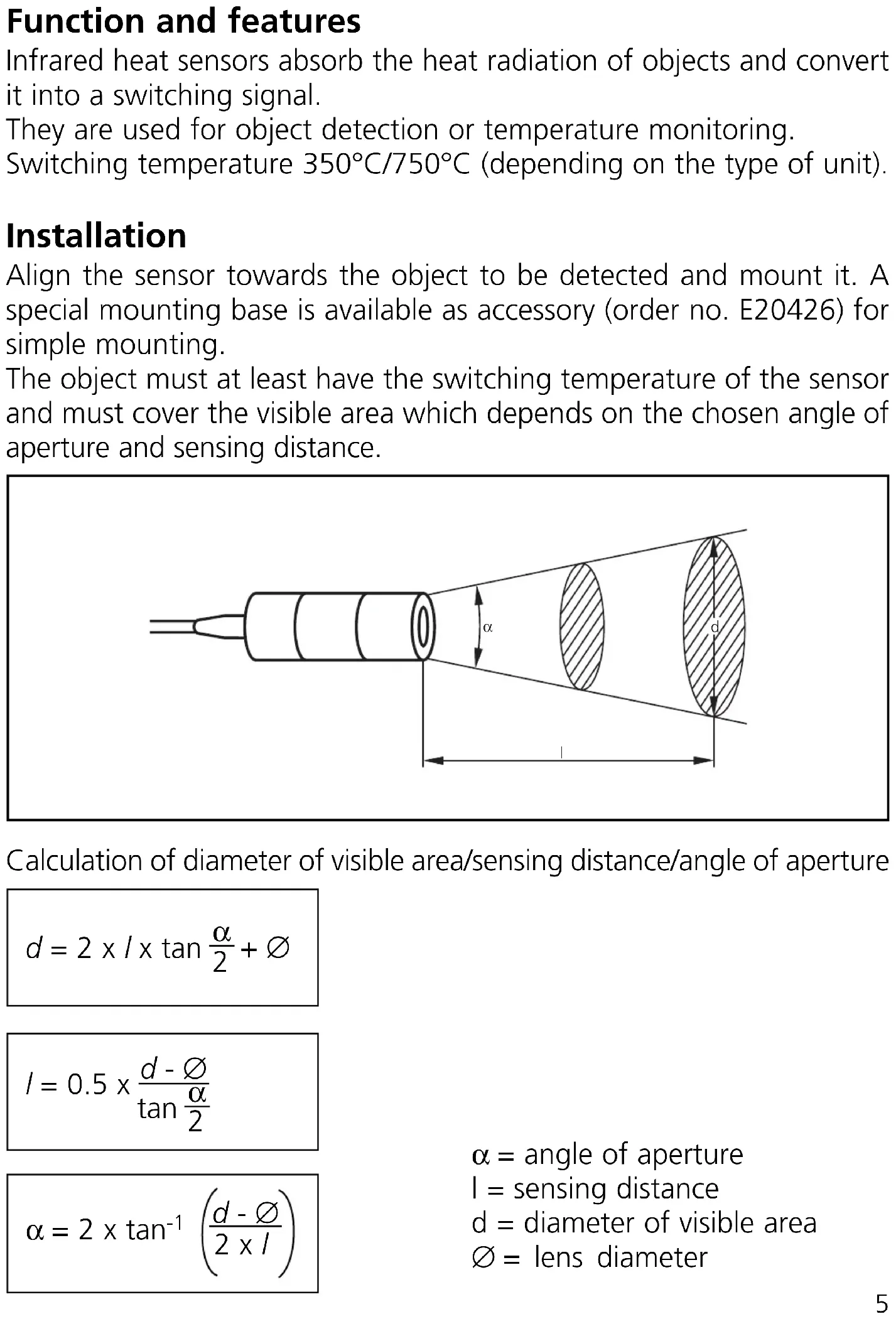 Function and features Infrared heat sensors absorb the heat radiation of objects and convert it into a switching signal. They are used for object detection or temperature monitoring. Switching temperature 350°C/750°C (depending on the type of unit). Installation Align the sensor towards the object to be detected and mount it. A special mounting base is available as accessory (order no. E20426) for simple mounting. The object must at least have the switching temperature of the sensor and must cover the visible area which depends on the chosen angle of aperture and sensing distance. Calculation of diameter of visible area/sensing distance/angle of aperture