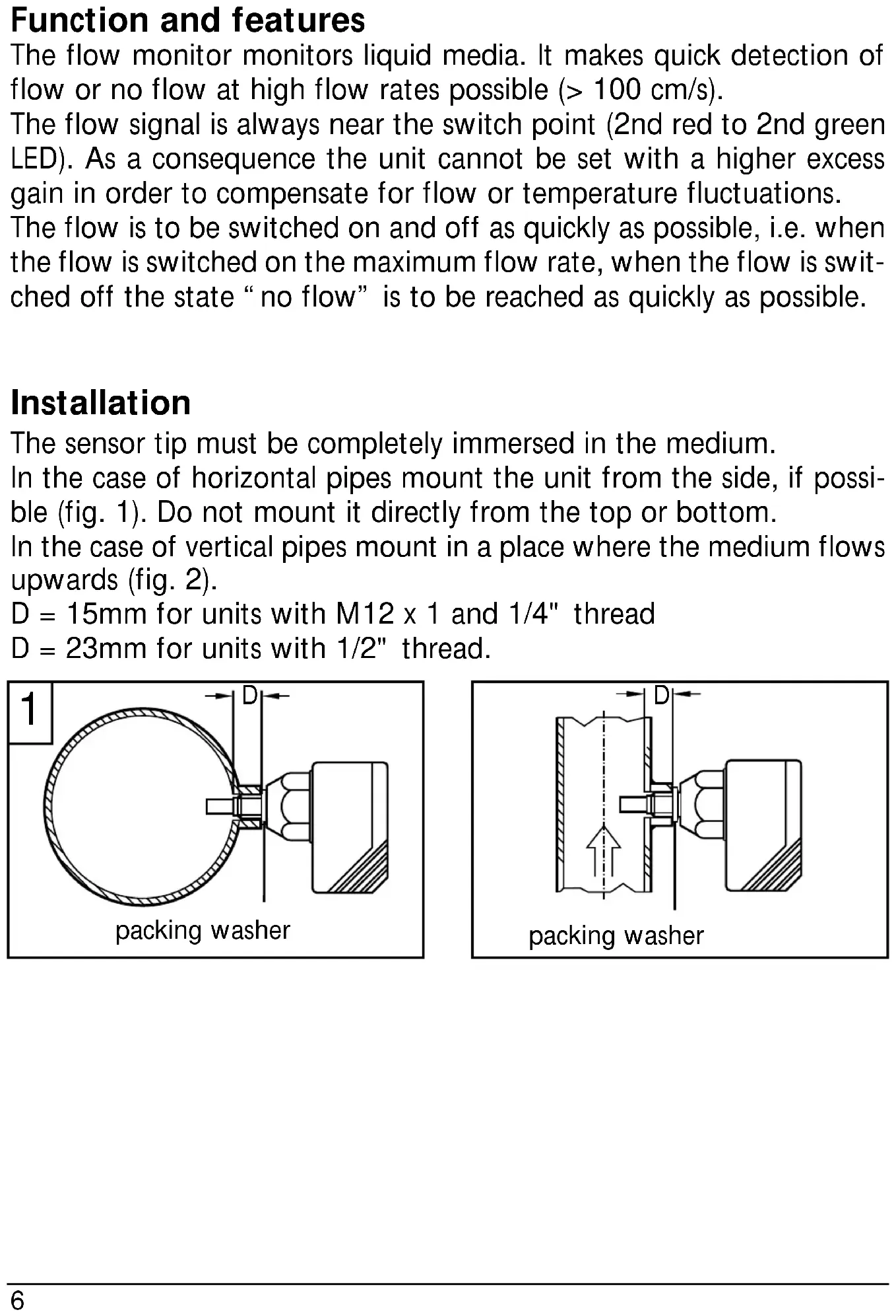 EN 61000-4-6 3 V; 0,15 ... 80 MHzFunction and features The flow monitor monitors liquid media. It makes quick detection of flow or no flow at high flow rates possible (> 100 cm/s). The flow signal is always near the switch point (2nd red to 2nd green LED). As a consequence the unit cannot be set with a higher excess gain in order to compensate for flow or temperature fluctuations. The flow is to be switched on and off as quickly as possible, i.e. when the flow is switched on the maximum flow rate, when the flow is swit- ched off the state “no flow” is to be reached as quickly as possible. Installation The sensor tip must be completely immersed in the medium. In the case of horizontal pipes mount the unit from the side, if possi- ble (fig. 1). Do not mount it directly from the top or bottom. In the case of vertical pipes mount in a place where the medium flows upwards (fig. 2). D = 15mm for units with M12 x 1 and 1/4" thread D = 23mm for units with 1/2" thread.