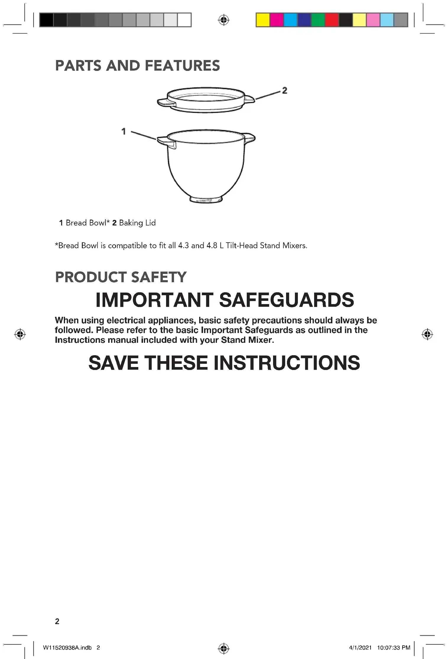 1 Bread Bowl* 2 Baking Lid PRODUCT SAFETY IMPORTANT SAFEGUARDS When using electrical appliances, basic safety precautions should always be followed. Please refer to the basic Important Safeguards as outlined in the Instructions manual included with your Stand Mixer.
