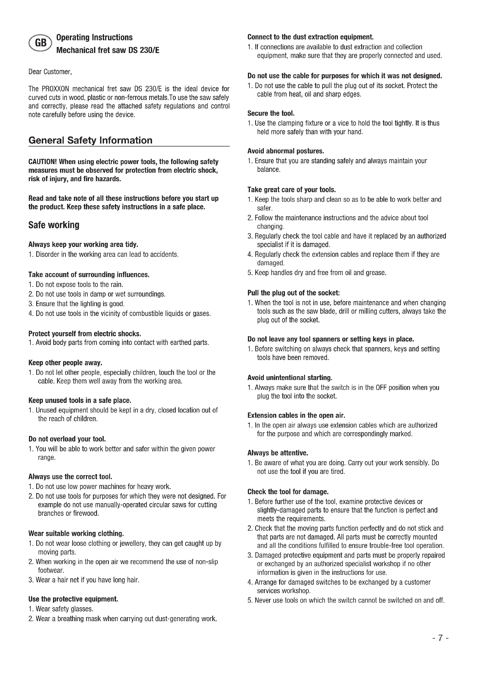 - DIN EN 61000-3-3 / 05.2002 Dipl.-Ing. Jörg Wagner PROXXON S.A. Geschäftsbereich Gerätesicherheit- 7 - Operating Instructions Mechanical fret saw DS 230/E Dear Customer, The PROXXON mechanical fret saw DS 230/E is the ideal device for curved cuts in wood, plastic or non-ferrous metals.To use the saw safely and correctly, please read the attached safety regulations and control note carefully before using the device. General Safety Information CAUTION! When using electric power tools, the following safety measures must be observed for protection from electric shock, risk of injury, and fire hazards. Read and take note of all these instructions before you start up the product. Keep these safety instructions in a safe place. Safe working Always keep your working area tidy.