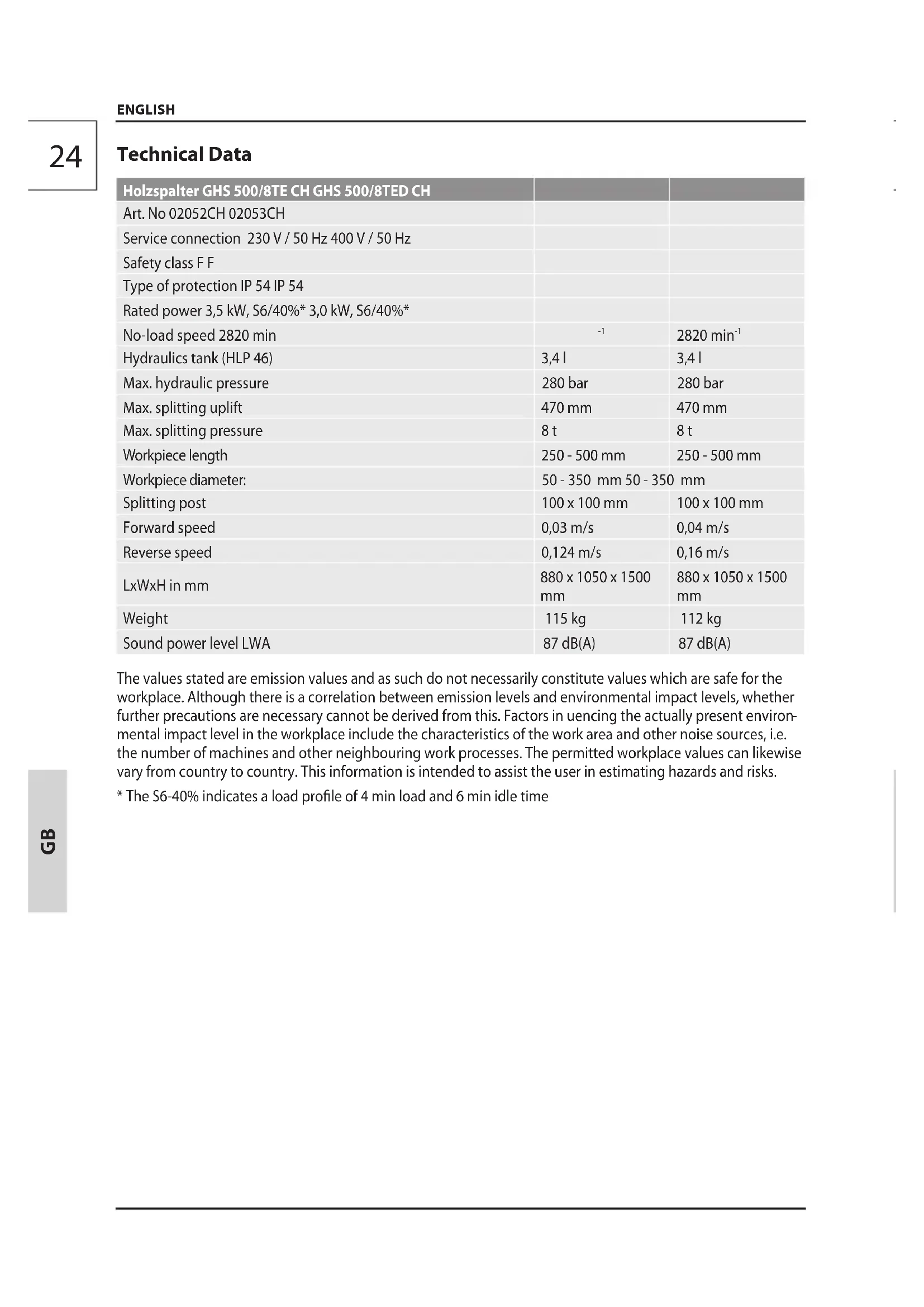 ning or improper disposal is punishable by law. Symbols CAUTION! WARNING WARNING! Read the Operating Instruc- tions Caution! Unplug the machine before any servicing or repair! Wear eye protective goggles ! Wear ear protectors! Safety gloves to be used! Wear safety shoes with steel reinforce- ment! Use of crane Caution! Moving parts of the machine! Danger! Keep away from moving machine parts! To be operated by 1 person only! Do not touch in the splitting area! Protect against humidity. Never expose tool to rain. Dangerous voltage Warning against hand injuries Warning against thrown-o items Keep distance of persons Observe to keep out of dangerous zone Rotation direction 2 people are needed for implementation.29