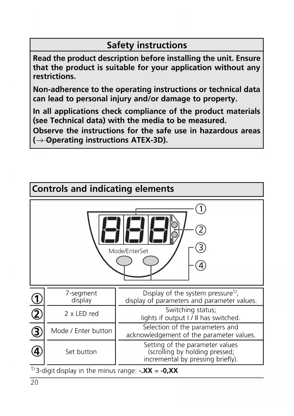 Grenzpunkteinstellung nach DIN 1608620 Safety instructions Read the product description before installing the unit. Ensure that the product is suitable for your application without any restrictions. Non-adherence to the operating instructions or technical data can lead to personal injury and/or damage to property. In all applications check compliance of the product materials (see Technical data) with the media to be measured. Observe the instructions for the safe use in hazardous areas