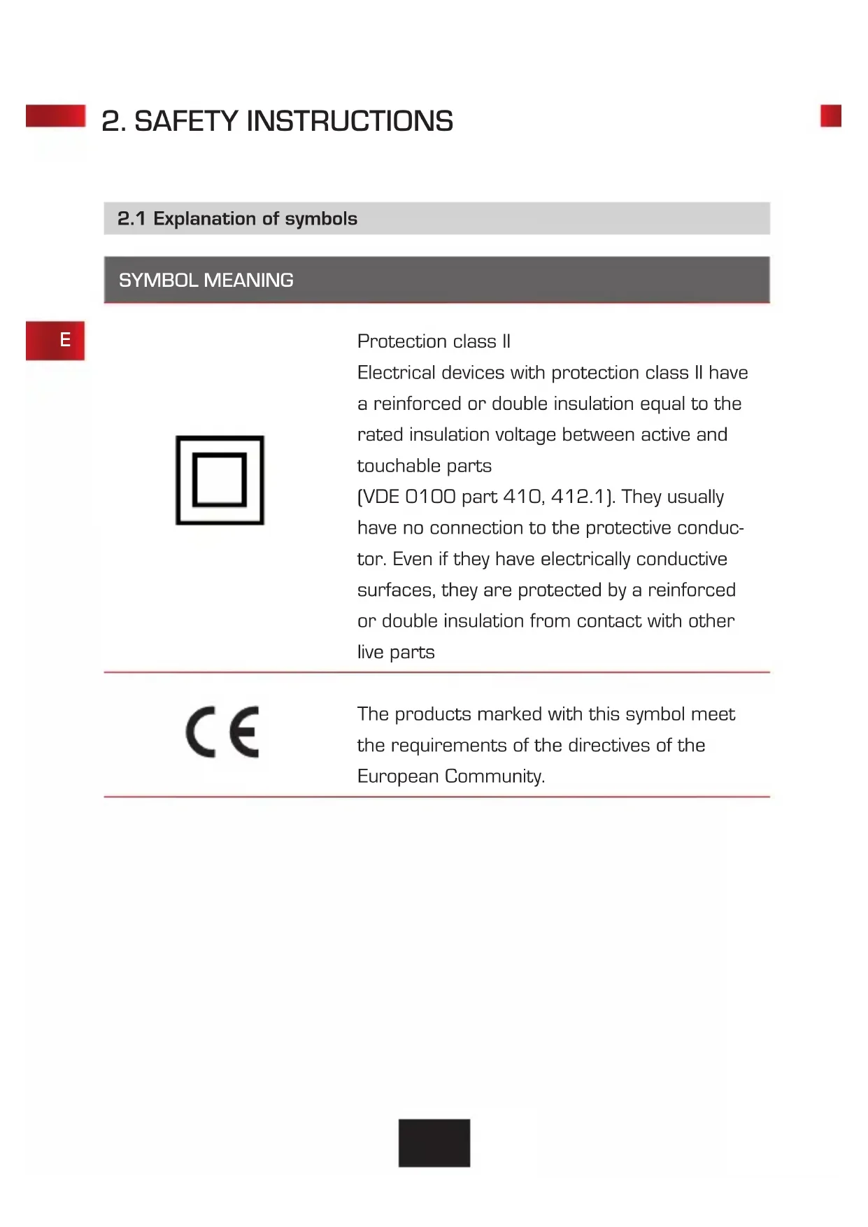 SYMBOL MEANING Protection class II Electrical devices with protection class II have a reinforced or double insulation equal to the rated insulation voltage between active and touchable parts (VDE 0100 part 410, 412.1). They usually have no connection to the protective conduc- tor. Even if they have electrically conductive surfaces, they are protected by a reinforced or double insulation from contact with other live parts The products marked with this symbol meet the requirements of the directives of the European Community.