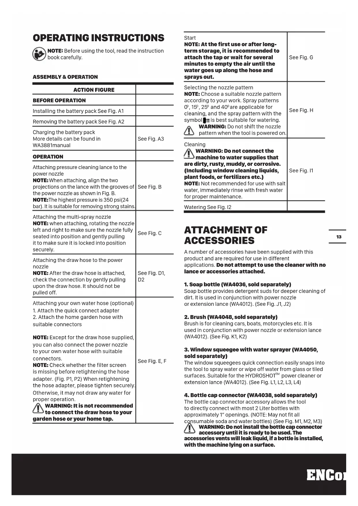 OPERATING INSTRUCTIONS NOTE Before using the tool, read the instruction book carefully. ASSEMBLY & OPERATION ACTION FIGURE BEFORE OPERATION Installing the battery pack See Fig. A1 Removing the battery pack See Fig. A2 Charging the battery pack More details can be found in WA3881manual See Fig. A3 OPERATION Attaching pressure cleaning lance to the power nozzle NOTE: When attaching, align the two projections on the lance with the grooves of the power nozzle as shown in Fig. B. NOTE: The highest pressure is 350 psi(24 bar). It is suitable for removing strong stains. See Fig. B Attaching the multi-spray nozzle NOTE: when attaching, rotating the nozzle left and right to make sure the nozzle fully seated into position and gently pulling it to make sure it is locked into position securely. See Fig. C Attaching the draw hose to the power nozzle NOTE: After the draw hose is attached, check the connection by gently pulling upon the draw hose. It should not be pulled off. See Fig. D1,