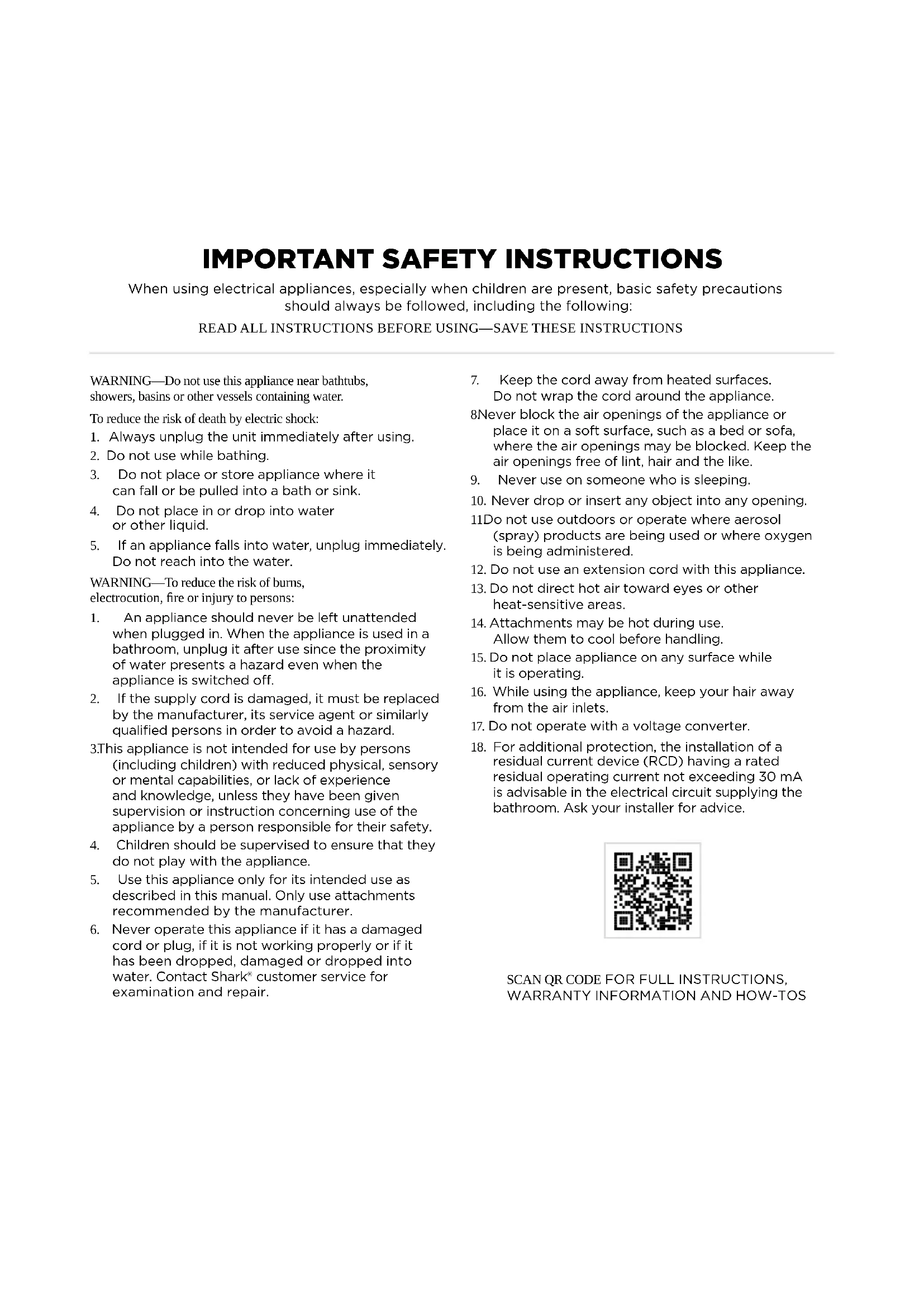 When using electrical appliances, especially when children are present, basic safety precautions should always be followed, including the following: READ ALL INSTRUCTIONS BEFORE USING—SAVE THESE INSTRUCTIONS SCAN QR CODE FOR FULL INSTRUCTIONS, WARRANTY INFORMATION AND HOW-TOSWhen a consumer buys a product in the Europe, they get the benefit of legal rights relating to the quality of the product (your statutory rights). You can enforce these rights against your retailer. However, at Shark® we are so confident about the quality of our products that we give you an additional manufacturer’s guarantee of two years These terms and conditions relate to our manufacturer’s guarantee only – your statutory rights are unaected. The conditions below describe the prerequisites and scope of our guarantee. They do not aect your statutory rights or the obligations of your retailer and your contract with them. Shark® Guarantees Your Shark® hairdryer constitutes a sizeable investment. Your new hairdryer needs to work properly for as long as possible. The guarantee it comes with is an important consideration - and reflects how much confidence the manufacturer has in its product and manufacturing quality. Every Shark® machine comes with a free parts and labour guarantee. Our customer service helpline (0800 862 0453) is open from 9.00am to 6.00pm Monday - Friday. It’s free to call and you’ll be put straight through to a Shark® representative. You’ll also find online support at sharkbeauty.eu. How do I register my Shark® guarantee? You can register your guarantee online within 28 days of purchase. To save time, you’ll need the following information about your hairdryer: