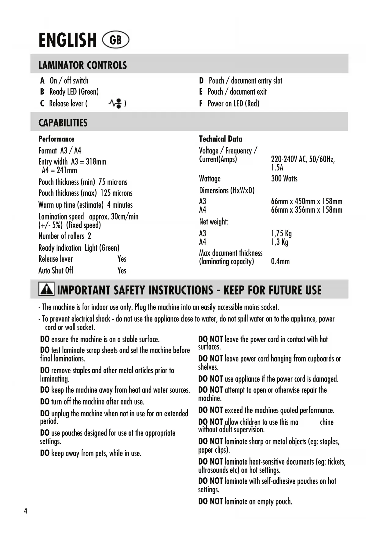 D Pouch / document entry slot E Pouch / document exit F Power on LED (Red) CAPABILITIES Performance Format A3 / A4 Entry width A3 = 318mm A4 = 241mm Pouch thickness (min) 75 microns Pouch thickness (max) 125 microns Warm up time (estimate) 4 minutes Lamination speed approx. 30cm/min (+/- 5%) (fixed speed) Number of rollers 2 Ready indication Light (Green) Release lever Yes Auto Shut Off Yes Technical Data Voltage / Frequency / Current(Amps) 220-240V AC, 50/60Hz, 1.5A Wattage 300 Watts Dimensions (HxWxD) A3 66mm x 450mm x 158mm A4 66mm x 356mm x 158mm Net weight: A3 1,75 Kg A4 1,3 Kg Max document thickness (laminating capacity) 0.4mm - The machine is for indoor use only. Plug the machine into an easily accessible mains socket. - To prevent electrical shock - do not use the appliance close to water, do not spill water on to the appliance, power cord or wall socket. DO ensure the machine is on a stable surface. DO test laminate scrap sheets and set the machine before final laminations. DO remove staples and other metal articles prior to laminating. DO keep the machine away from heat and water sources. DO turn off the machine after each use. DO unplug the machine when not in use for an extended period. DO use pouches designed for use at the appropriate settings. DO keep away from pets, while in use. DO NOT leave the power cord in contact with hot surfaces. DO NOT leave power cord hanging from cupboards or shelves. DO NOT use appliance if the power cord is damaged. DO NOT attempt to open or otherwise repair the machine. DO NOT exceed the machines quoted performance. DO NOT allow children to use this ma chine without adult supervision. DO NOT laminate sharp or metal objects (eg: staples, paper clips). DO NOT laminate heat-sensitive documents (eg: tickets, ultrasounds etc) on hot settings. DO NOT laminate with self-adhesive pouches on hot settings. DO NOT laminate an empty pouch.FEATURES & TIPS ‘Release’ function To remove or re-align a pouch during lamination, activate the release lever located on the back of the machine. The pouch can only be removed from the entry slot when the lever is activated. Auto Shut Off After 30 minutes the machine will automatically go in to Auto Shut Off mode. The Power LED will flash red for 5 minutes and then turn off. The ready LED will turn off. To continue using the machine press the ON/OFF switch. The machine will reset itself. t For best results, use Fellowes ® brand pouches: