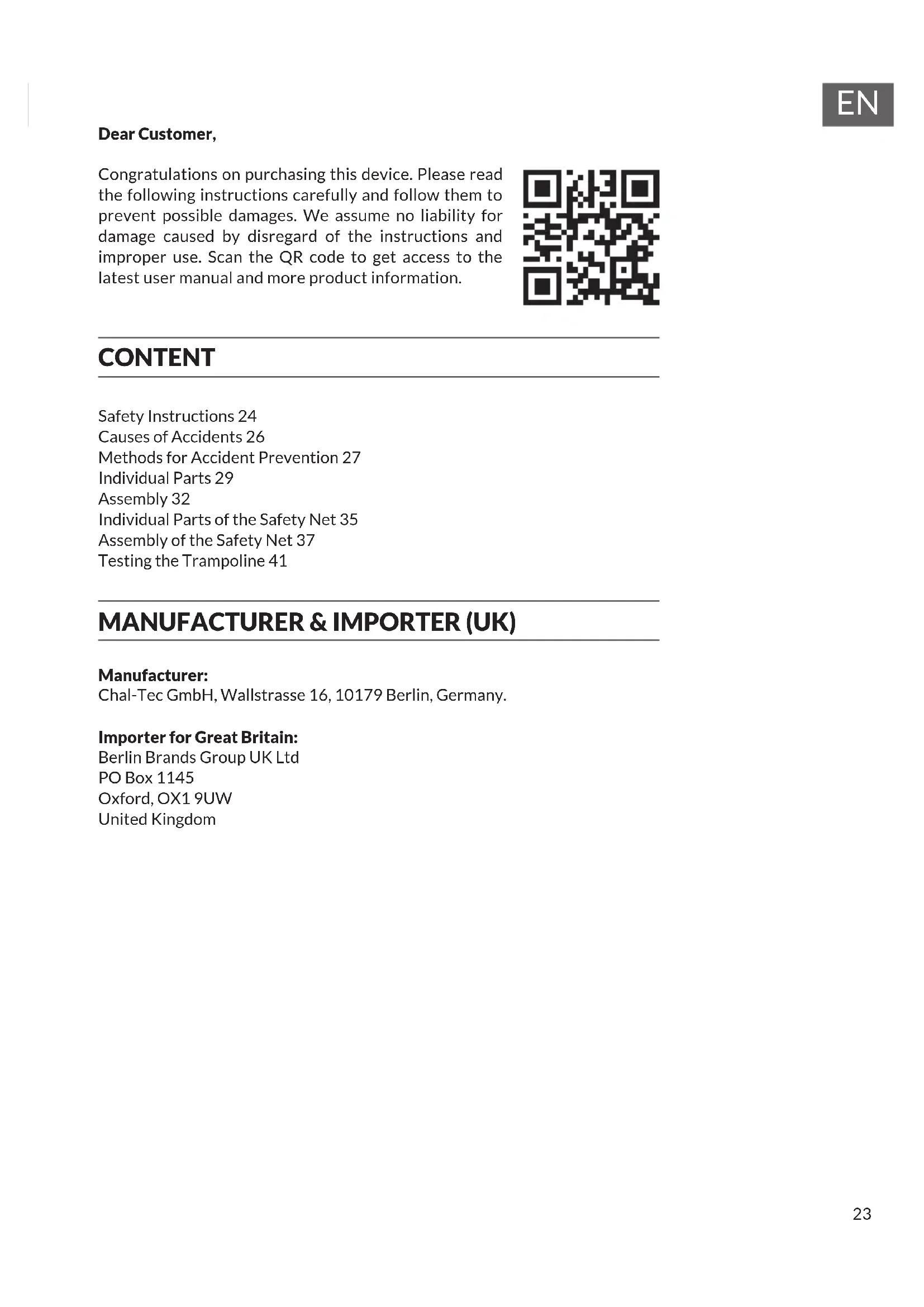 Dear Customer, Congratulations on purchasing this device. Please read the following instructions carefully and follow them to prevent possible damages. We assume no liability for damage caused by disregard of the instructions and improper use. Scan the QR code to get access to the latest user manual and more product information. CONTENT Safety Instructions 24 Causes of Accidents 26 Methods for Accident Prevention 27 Individual Parts 29 Assembly 32 Individual Parts of the Safety Net 35 Assembly of the Safety Net 37 Testing the Trampoline 41 MANUFACTURER & IMPORTER (UK) Manufacturer: Chal-Tec GmbH, Wallstrasse 16, 10179 Berlin, Germany. Importer for Great Britain: Berlin Brands Group UK Ltd PO Box 1145 Oxford, OX1 9UW United Kingdom24