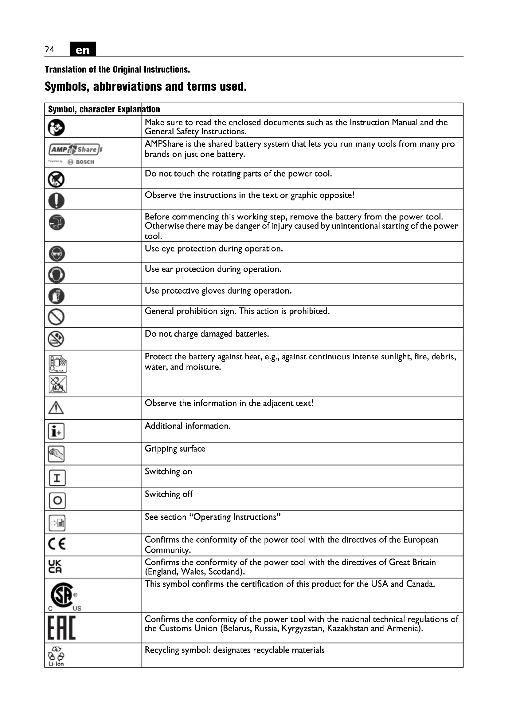 Translation of the Original Instructions. Symbols, abbreviations and terms used. Symbol, character Explanation Make sure to read the enclosed documents such as the Instruction Manual and the General Safety Instructions. AMPShare is the shared battery system that lets you run many tools from many pro brands on just one battery. Do not touch the rotating parts of the power tool. Observe the instructions in the text or graphic opposite! Before commencing this working step, remove the battery from the power tool. Otherwise there may be danger of injury caused by unintentional starting of the power tool. Use eye protection during operation. Use ear protection during operation. Use protective gloves during operation. General prohibition sign. This action is prohibited. Do not charge damaged batteries. Protect the battery against heat, e.g., against continuous intense sunlight, fire, debris, water, and moisture. Observe the information in the adjacent text! Additional information. Gripping surface Switching on Switching off See section “Operating Instructions” Confirms the conformity of the power tool with the directives of the European Community. Confirms the conformity of the power tool with the directives of Great Britain (England, Wales, Scotland). This symbol confirms the certification of this product for the USA and Canada. Confirms the conformity of the power tool with the national technical regulations of the Customs Union (Belarus, Russia, Kyrgyzstan, Kazakhstan and Armenia). Recycling symbol: designates recyclable materials max.50°C25