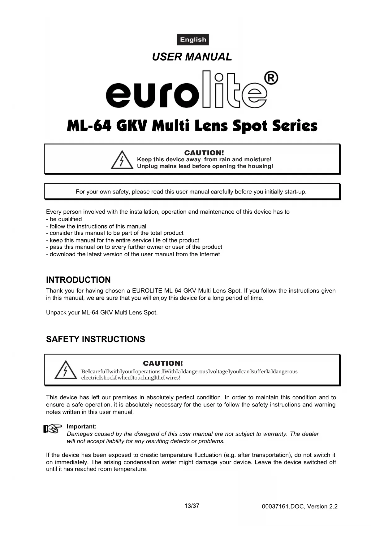 Thank you for having chosen a EUROLITE ML-64 GKV Multi Lens Spot. If you follow the instructions given in this manual, we are sure that you will enjoy this device for a long period of time.