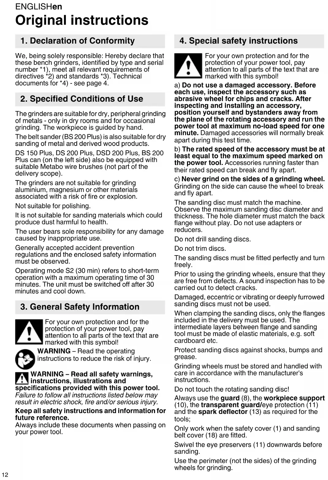 Original instructions We, being solely responsible: Hereby declare that these bench grinders, identified by type and serial number *1), meet all relevant requirements of directives *2) and standards *3). Technical documents for *4) - see page 4. The grinders are suitable for dry, peripheral grinding of metals - only in dry rooms and for occasional grinding. The workpiece is guided by hand. The belt sander (BS 200 Plus) is also suitable for dry sanding of metal and derived wood products. DS 150 Plus, DS 200 Plus, DSD 200 Plus, BS 200 Plus can (on the left side) also be equipped with suitable Metabo wire brushes (not part of the delivery scope). The grinders are not suitable for grinding aluminium, magnesium or other materials associated with a risk of fire or explosion. Not suitable for polishing. It is not suitable for sanding materials which could produce dust harmful to health. The user bears sole responsibility for any damage caused by inappropriate use. Generally accepted accident prevention regulations and the enclosed safety information must be observed. Operating mode S2 (30 min) refers to short-term operation with a maximum operating time of 30 minutes. The unit must be switched off after 30 minutes and cool down. For your own protection and for the protection of your power tool, pay attention to all parts of the text that are marked with this symbol! WARNING – Read the operating instructions to reduce the risk of injury. WARNING – Read all safety warnings, instructions, illustrations and specifications provided with this power tool. Failure to follow all instructions listed below may result in electric shock, fire and/or serious injury. Keep all safety instructions and information for future reference. Always include these documents when passing on your power tool. For your own protection and for the protection of your power tool, pay attention to all parts of the text that are marked with this symbol! a) Do not use a damaged accessory. Before each use, inspect the accessory such as abrasive wheel for chips and cracks. After inspecting and installing an accessory, position yourself and bystanders away from the plane of the rotating accessory and run the power tool at maximum no-load speed for one minute. Damaged accessories will normally break apart during this test time. b) The rated speed of the accessory must be at least equal to the maximum speed marked on the power tool. Accessories running faster than their rated speed can break and fly apart. c) Never grind on the sides of a grinding wheel. Grinding on the side can cause the wheel to break and fly apart. The sanding disc must match the machine. Observe the maximum sanding disc diameter and thickness. The hole diameter must match the back flange without play. Do not use adapters or reducers. Do not drill sanding discs. Do not trim discs. The sanding discs must be fitted perfectly and turn freely. Prior to using the grinding wheels, ensure that they are free from defects. A sound inspection has to be carried out to detect cracks. Damaged, eccentric or vibrating or deeply furrowed sanding discs must not be used. When clamping the sanding discs, only the flanges included in the delivery must be used. The intermediate layers between flange and sanding tool must be made of elastic materials, e.g. soft cardboard etc. Protect sanding discs against shocks, bumps and grease. Grinding wheels must be stored and handled with care in accordance with the manufacturer's instructions. Do not touch the rotating sanding disc! Always use the guard (8), the workpiece support (10), the transparent guard/eye protection (11) and the spark deflector (13) as required for the tools; Only work when the safety cover (1) and sanding belt cover (18) are fitted. Swivel the eye preservers (11) downwards before sanding. Use the perimeter (not the sides) of the grinding wheels for grinding.