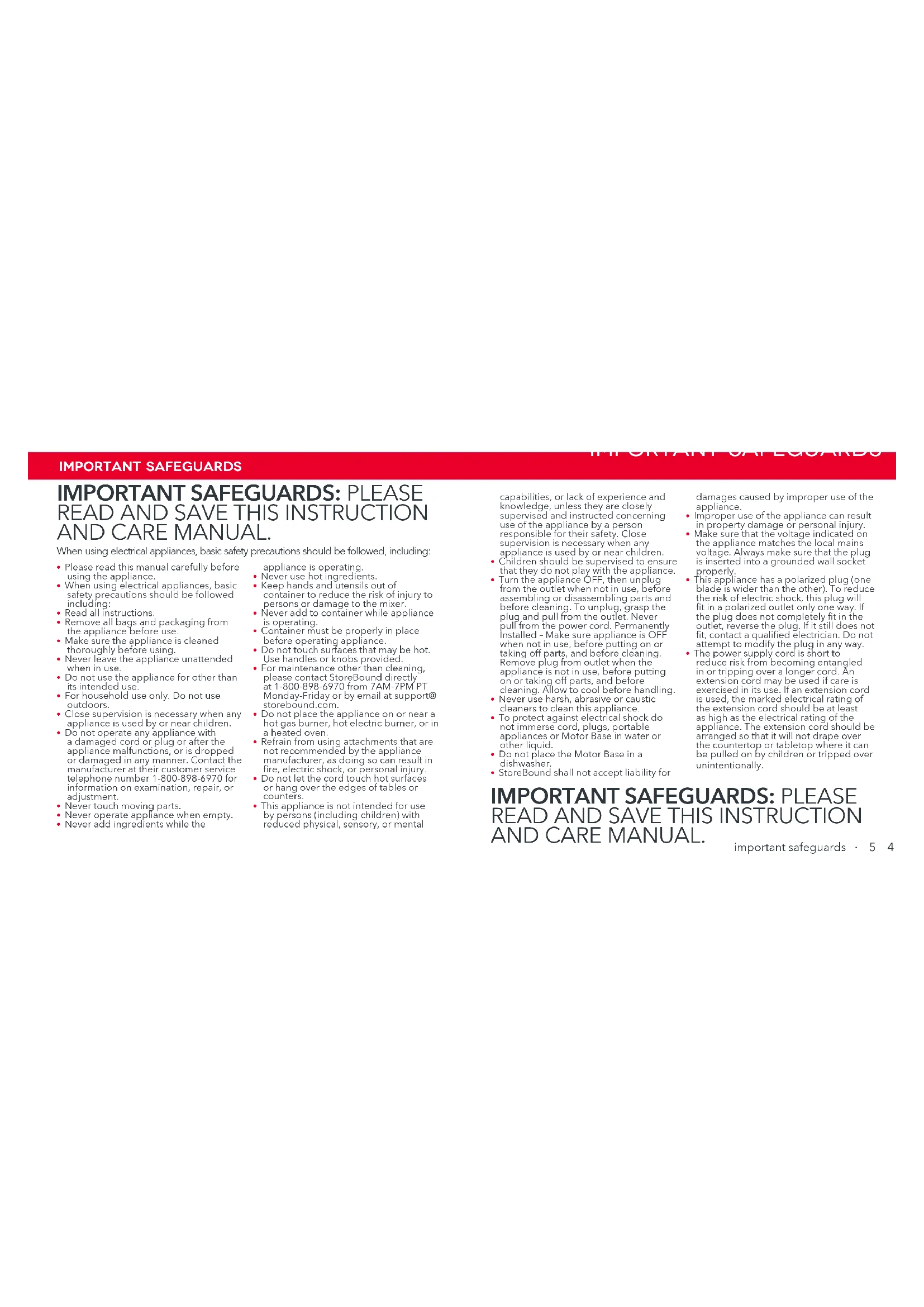 - Please read this manual carefully before using the appliance.• When using electrical appliances, basic safety precautions should be followed including:• Read all instructions.• Remove all bags and packaging from the appliance before use. • Make sure the appliance is cleaned thoroughly before using.• Never leave the appliance unattended when in use. • Do not use the appliance for other than its intended use. • For household use only. Do not use outdoors.• Close supervision is necessary when any appliance is used by or near children.• Do not operate any appliance with a damaged cord or plug or after the appliance malfunctions, or is dropped or damaged in any manner. Contact the manufacturer at their customer service telephone number 1-800-898-6970 for information on examination, repair, or adjustment. • Never touch moving parts.• Never operate appliance when empty. • Never add ingredients while the appliance is operating.• Never use hot ingredients. • Keep hands and utensils out of container to reduce the risk of injury to persons or damage to the mixer.• Never add to container while appliance is operating.• Container must be properly in place before operating appliance.• Do not touch surfaces that may be hot. Use handles or knobs provided.• For maintenance other than cleaning, please contact StoreBound directly at 1-800-898-6970 from 7AM-7PM PT Monday-Friday or by email at support@storebound.com.• Do not place the appliance on or near a hot gas burner, hot electric burner, or in a heated oven.• Refrain from using attachments that are not recommended by the appliance manufacturer, as doing so can result in re, electric shock, or personal injury.• Do not let the cord touch hot surfaces or hang over the edges of tables or counters.• This appliance is not intended for use by persons (including children) with reduced physical, sensory, or mental