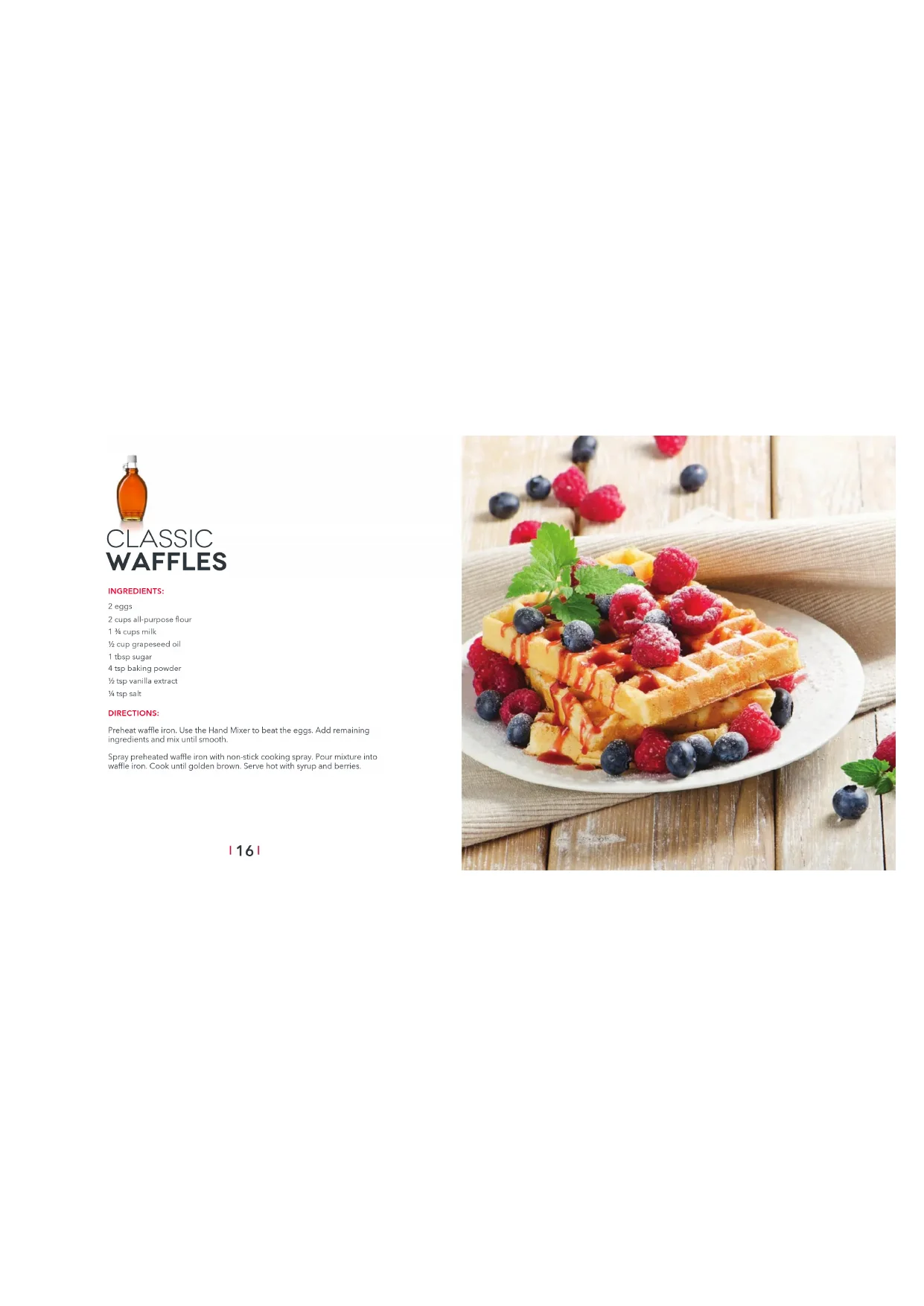 Spray preheated waffle iron with non-stick cooking spray. Pour mixture into waffle iron. Cook until golden brown. Serve hot with syrup and berries.