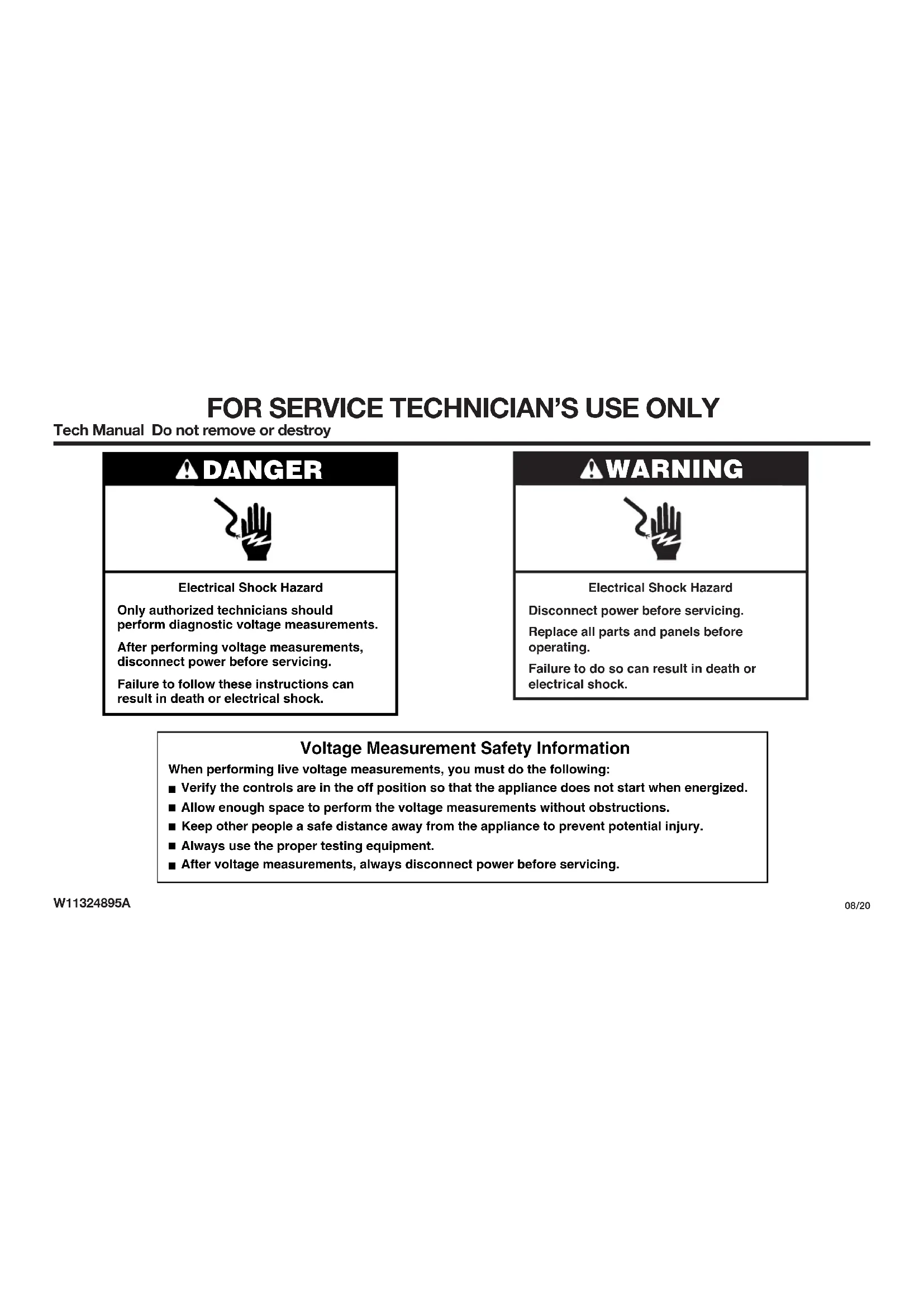 Tech Manual Do not remove or destroy W11324895A 08/20 WARNING Electrical Shock Hazard Disconnect power before servicing. Replace all parts and panels before operating. Failure to do so can result in death or electrical shock. DANGER Electrical Shock Hazard Only authorized technicians should perform diagnostic voltage measurements. After performing voltage measurements, disconnect power before servicing. Failure to follow these instructions can result in death or electrical shock. Voltage Measurement Safety Information When performing live voltage measurements, you must do the following:
