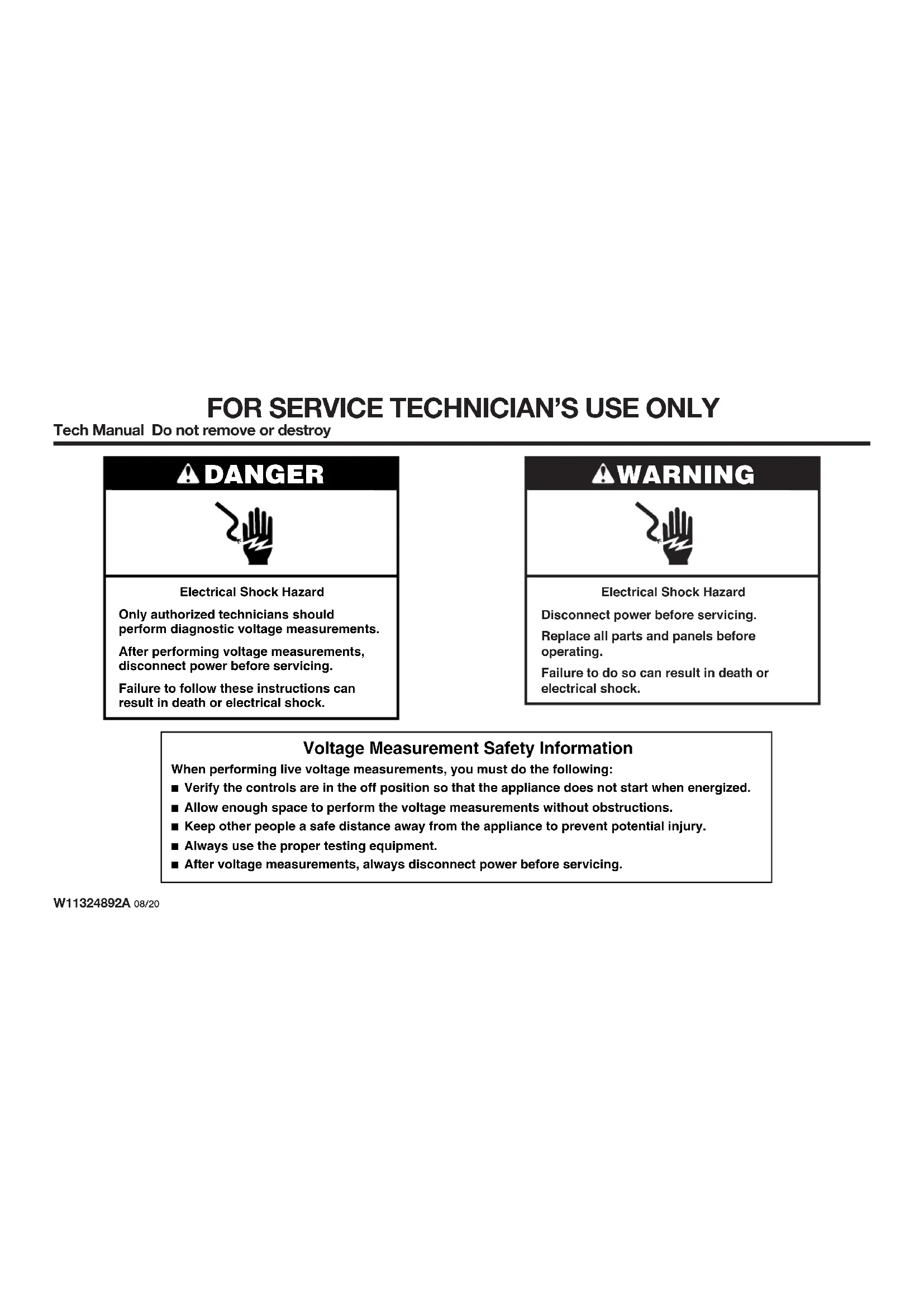 Tech Manual Do not remove or destroy W11324892A 08/20 WARNING Electrical Shock Hazard Disconnect power before servicing. Replace all parts and panels before operating. Failure to do so can result in death or electrical shock. DANGER Electrical Shock Hazard Only authorized technicians should perform diagnostic voltage measurements. After performing voltage measurements, disconnect power before servicing. Failure to follow these instructions can result in death or electrical shock. Voltage Measurement Safety Information When performing live voltage measurements, you must do the following: ■ Verify the controls are in the off position so that the appliance does not start when energized. ■ Allow enough space to perform the voltage measurements without obstructions.■ Keep other people a safe distance away from the appliance to prevent potential injury.■ Always use the proper testing equipment.■ After voltage measurements, always disconnect power before servicing.FOR SERVICE TECHNICIAN’S USE ONLY