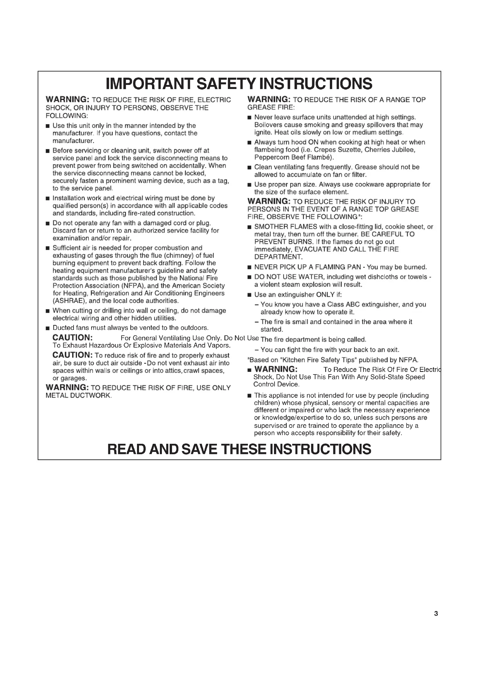 - UNIQUEMENT.2 TABLE OF CONTENTS TABLE DES MATIÈRES HOOD SAFETY You can be killed or seriously injured if you don't immediately You can be killed or seriously injured if you don't follow All safety messages will tell you what the potential hazard is, tell you how to reduce the chance of injury, and tell you what can happen if the instructions are not followed. Your safety and the safety of others are very important. We have provided many important safety messages in this manual and on your appliance. Always read and obey all safety messages. This is the safety alert symbol. This symbol alerts you to potential hazards that can kill or hurt you and others. All safety messages will follow the safety alert symbol and either the word “DANGER” or “WARNING.” These words mean: follow instructions. instructions. DANGER WARNING HOOD SAFETY p. 2