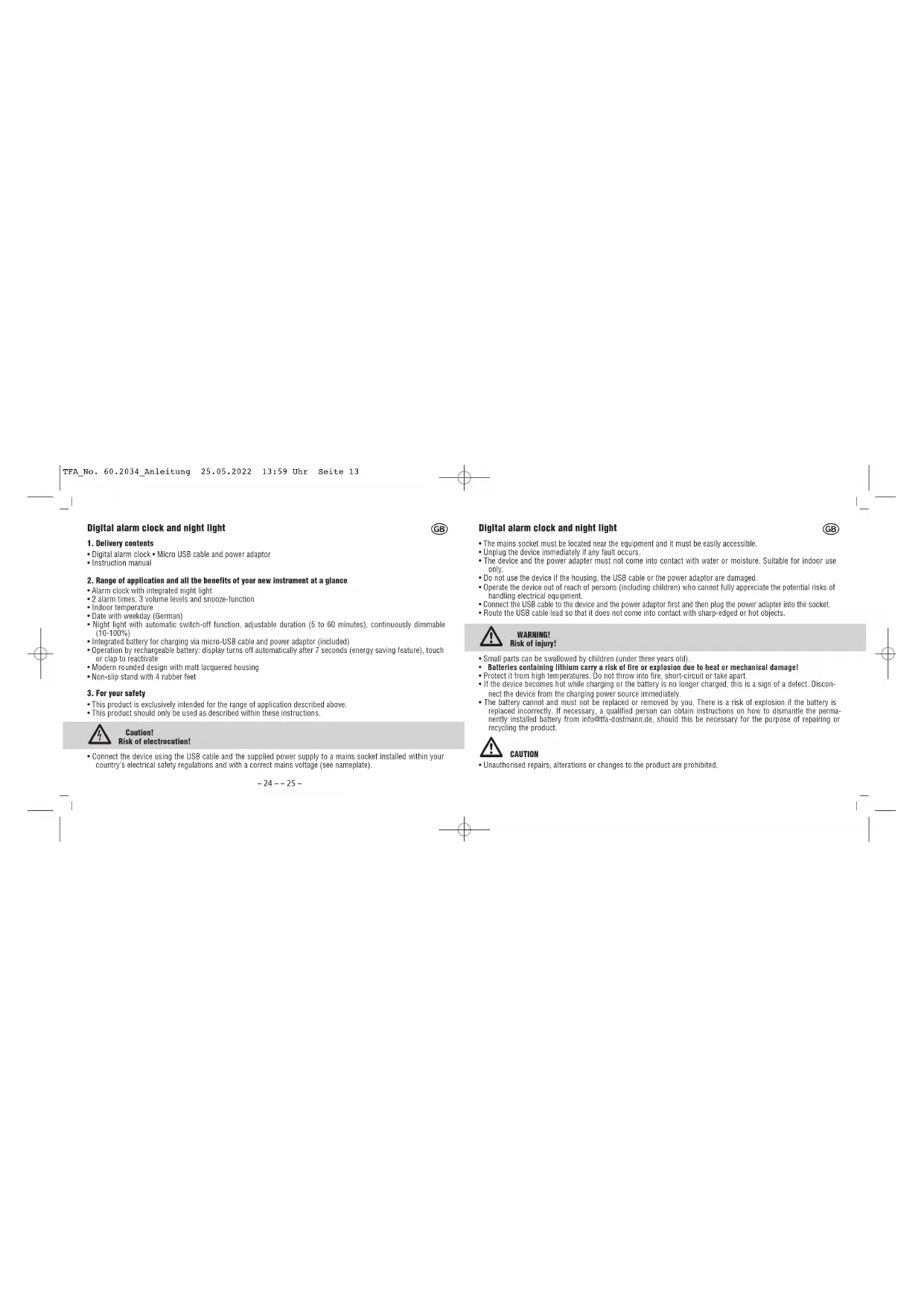 This product and its packaging have been manufactured using high-grade materials and components which can be recycled and reused. This reduces waste and protects the environment. Dispose of the packaging in an environmentally friendly manner using the collection systems that have been set up. Disposal of the electrical device Caution! This device contains a built-in battery that cannot be removed without damaging the housing. Improper removal represents a safety risk. Hand in the device unopened at the collection point; the device and battery will be disposed of properly. This product is labelled in accordance with the EU Waste Electrical and Electronic Equipment Directive (WEEE). This product must not be disposed of in ordinary household waste. As a consumer, you are required to take end-of-life devices to a designated collection point for the disposal of electrical and electronic equipment, in order to ensure environmentally-compatible disposal. Observe the current regulations in place! TFA_No. 60.2034_Anleitung 25.05.2022 13:59 Uhr Seite 16– 32 – – 33 – Digital alarm clock and night light