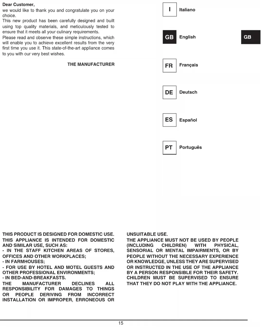 THAT THEY DO NOT PLAY WITH THE APPLIANCE. Dear Customer, we would like to thank you and congratulate you on your choice. This new product has been carefully designed and built using top quality materials, and meticulously tested to ensure that it meets all your culinary requirements. Please read and observe these simple instructions, which will enable you to achieve excellent results from the very first time you use it. This state-of-the-art appliance comes to you with our very best wishes. THE MANUFACTURER Italiano