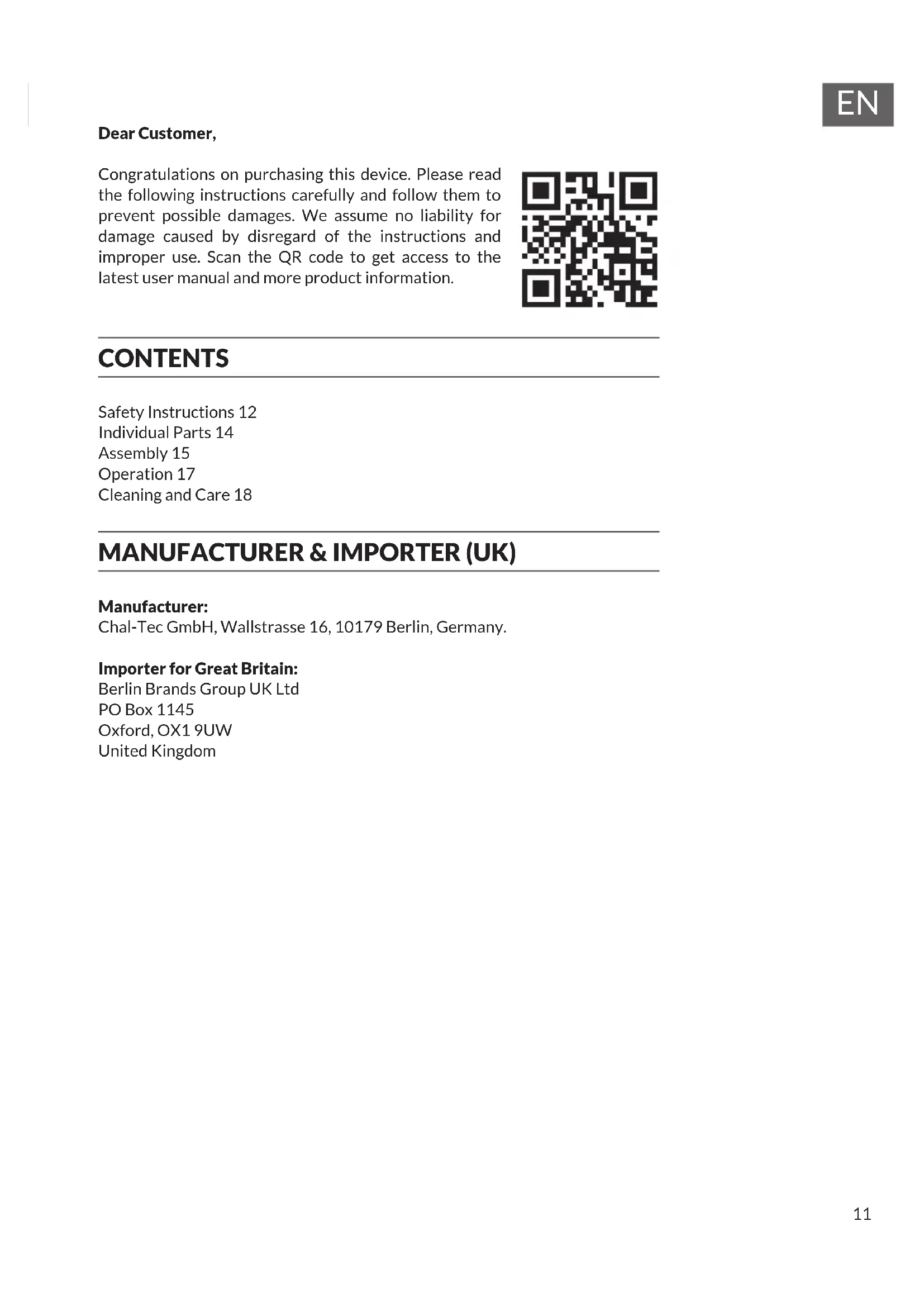 Dear Customer, Congratulations on purchasing this device. Please read the following instructions carefully and follow them to prevent possible damages. We assume no liability for damage caused by disregard of the instructions and improper use. Scan the QR code to get access to the latest user manual and more product information. CONTENTS Safety Instructions 12 Individual Parts 14 Assembly 15 Operation 17 Cleaning and Care 18 MANUFACTURER & IMPORTER (UK) Manufacturer: Chal-Tec GmbH, Wallstrasse 16, 10179 Berlin, Germany. Importer for Great Britain: Berlin Brands Group UK Ltd PO Box 1145 Oxford, OX1 9UW United Kingdom12