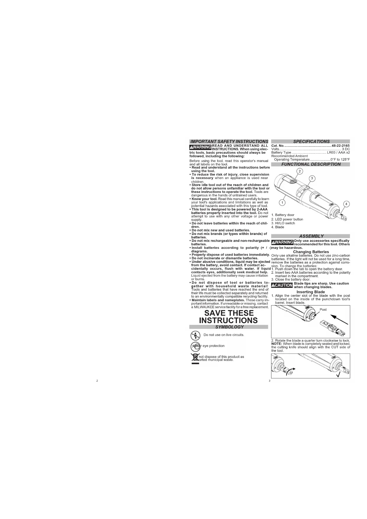 CUT tom of the wire slot between the insulation displacement connector's (IDC) blades. 66 Type Punchdown 1. Insert the 66 type blade into the tool.2. Select the proper force setting by referring to the above table. 3. Lay the wires in the post openings. 4. Place the blade into the wire post. Make sure the CUT side of the blade faces the end of the wire to be cut.5. Push down on the back end of the tool with the palm of your hand until impact. 6. Remove the blade from the wire post. Make sure the wire is properly seated at the bot-tom of the post between the insulation displacement connector's (IDC) blades. MAINTENANCE WARNING To reduce the risk of injury, always remove the battery before perform-ing any maintenance. Never disassemble the tool. Contact a MILWAUKEE service facility for ALL repairs. Maintain Tool Keep your tool in good repair by adopting a regular maintenance program. If the tool does not work properly, return the light to a MILWAUKEE service facility for repairs. WARNING To reduce the risk of personal in-jury and damage, never immerse your tool in liquid or allow a liquid to ow inside them. Cleaning Keep tool handles clean, dry and free of oil or grease. Use only mild soap and a damp cloth to clean the tool since certain cleaning agents and solvents are harmful to plastics and other insulated parts. Some of these include gasoline, turpentine, lacquer thinner, paint thinner, chlorinated cleaning solvents, ammonia and household detergents containing ammonia. Never use ammable or combustible solvents around tools. ACCESSORIES WARNING Only use accessories specically recommended for this tool. Others may be hazardous.Cat. No. Description48-22-2166 Extended Reach 110 Punchdown Blade48-22-2167 110/66 Combination Punchdown BladeFor a complete listing of accessories, go online to www.milwaukeetool.com or contact a local distributor. LIMITED WARRANTY - MEXICO,