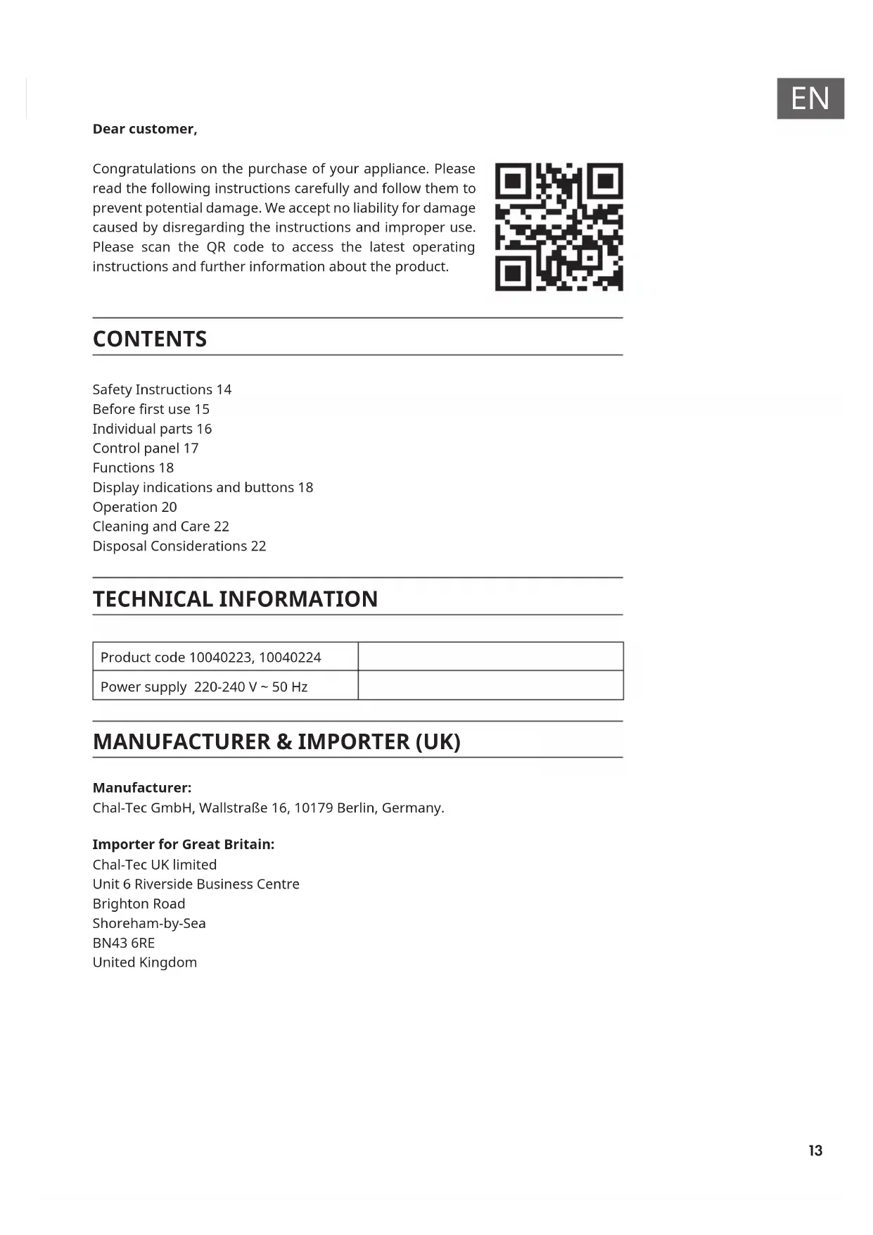 Dear customer, Congratulations on the purchase of your appliance. Please read the following instructions carefully and follow them to prevent potential damage. We accept no liability for damage caused by disregarding the instructions and improper use. Please scan the QR code to access the latest operating instructions and further information about the product. CONTENTS Safety Instructions 14 Before rst use 15 Individual parts 16 Control panel 17 Functions 18 Display indications and buttons 18 Operation 20 Cleaning and Care 22 Disposal Considerations 22 TECHNICAL INFORMATION Product code 10040223, 10040224 Power supply 220-240 V ~ 50 Hz MANUFACTURER & IMPORTER (UK) Manufacturer: Chal-Tec GmbH, Wallstraße 16, 10179 Berlin, Germany. Importer for Great Britain: Chal-Tec UK limited Unit 6 Riverside Business Centre Brighton Road Shoreham-by-Sea BN43 6RE United Kingdom14