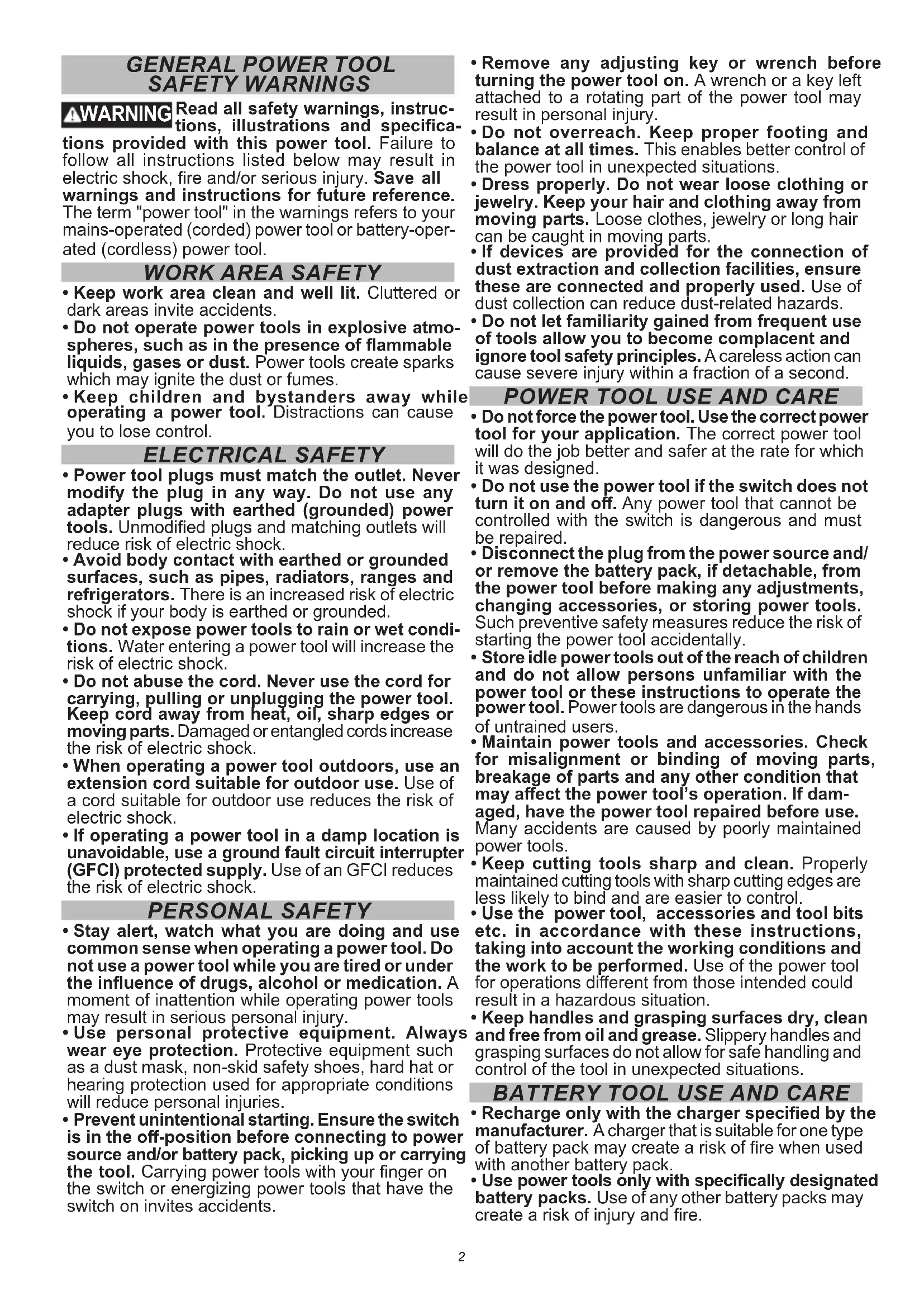 SAFETY WARNINGS WARNING Read all safety warnings, instruc- tions, illustrations and specica- tions provided with this power tool. Failure to follow all instructions listed below may result in electric shock, re and/or serious injury. Save all warnings and instructions for future reference. The term "power tool" in the warnings refers to your mains-operated (corded) power tool or battery-oper- ated (cordless) power tool.