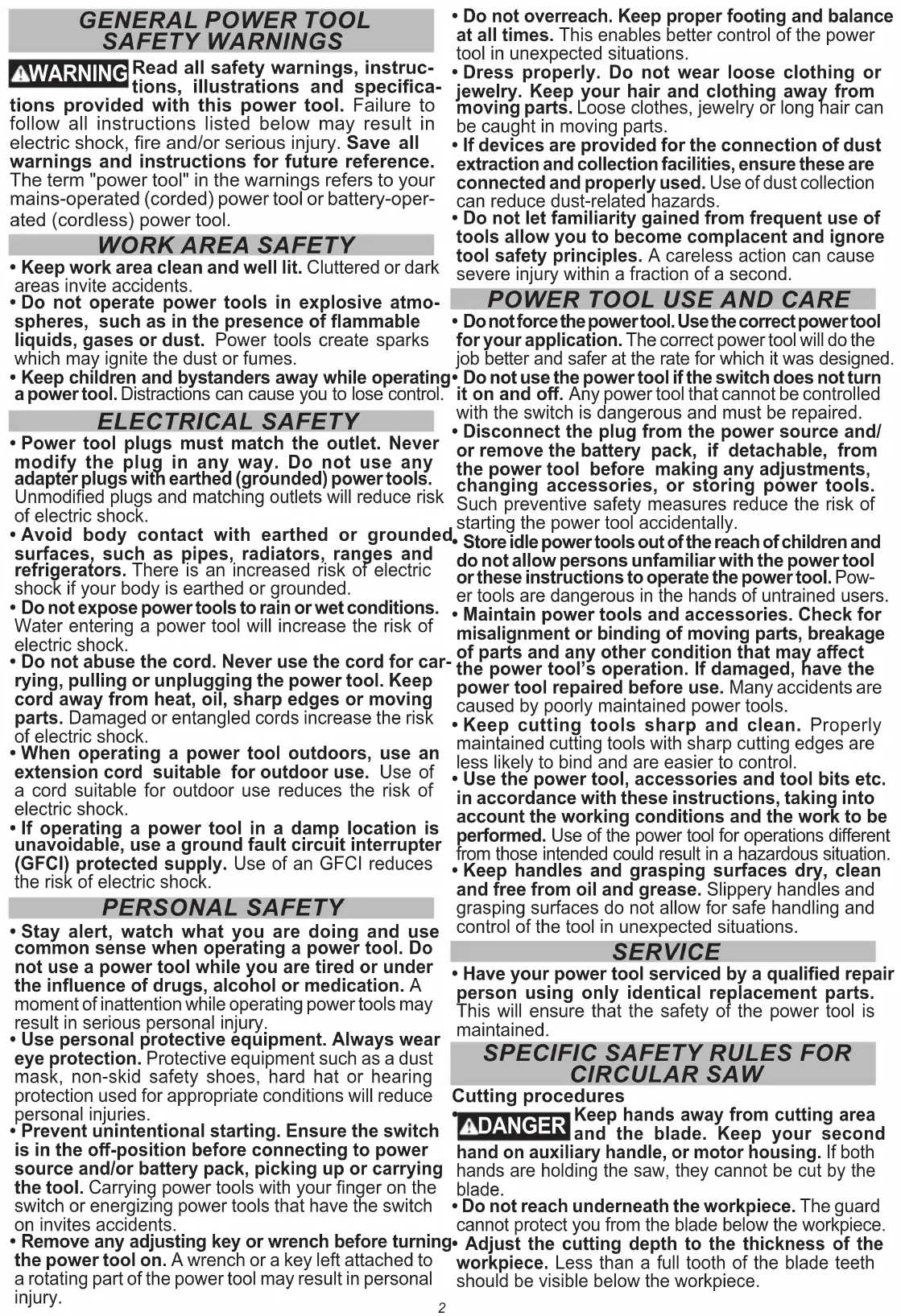 - Check lower guard for proper closing before each use. Do not operate the saw if lower guard does not move freely and close instantly. Never clamp or tie the lower guard into the open position. If saw is accidentally dropped, lower guard may be bent. Raise the lower guard with the retracting handle and make sure it moves freely and does not touch the blade or any other part, in all angles and depths of cut.