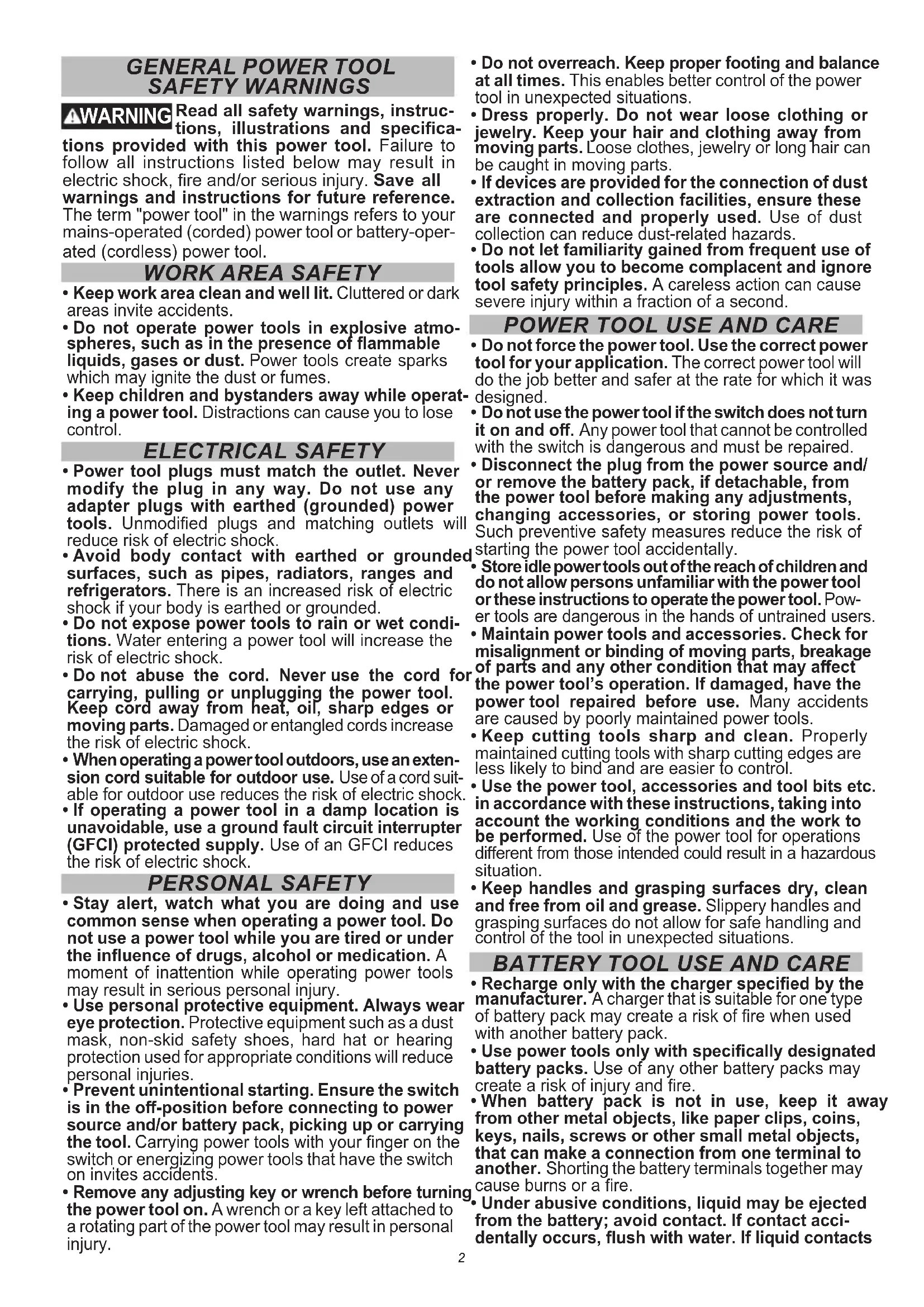 - If operating a power tool in a damp location is unavoidable, use a ground fault circuit interrupter (GFCI) protected supply. Use of an GFCI reduces the risk of electric shock. PERSONAL SAFETY