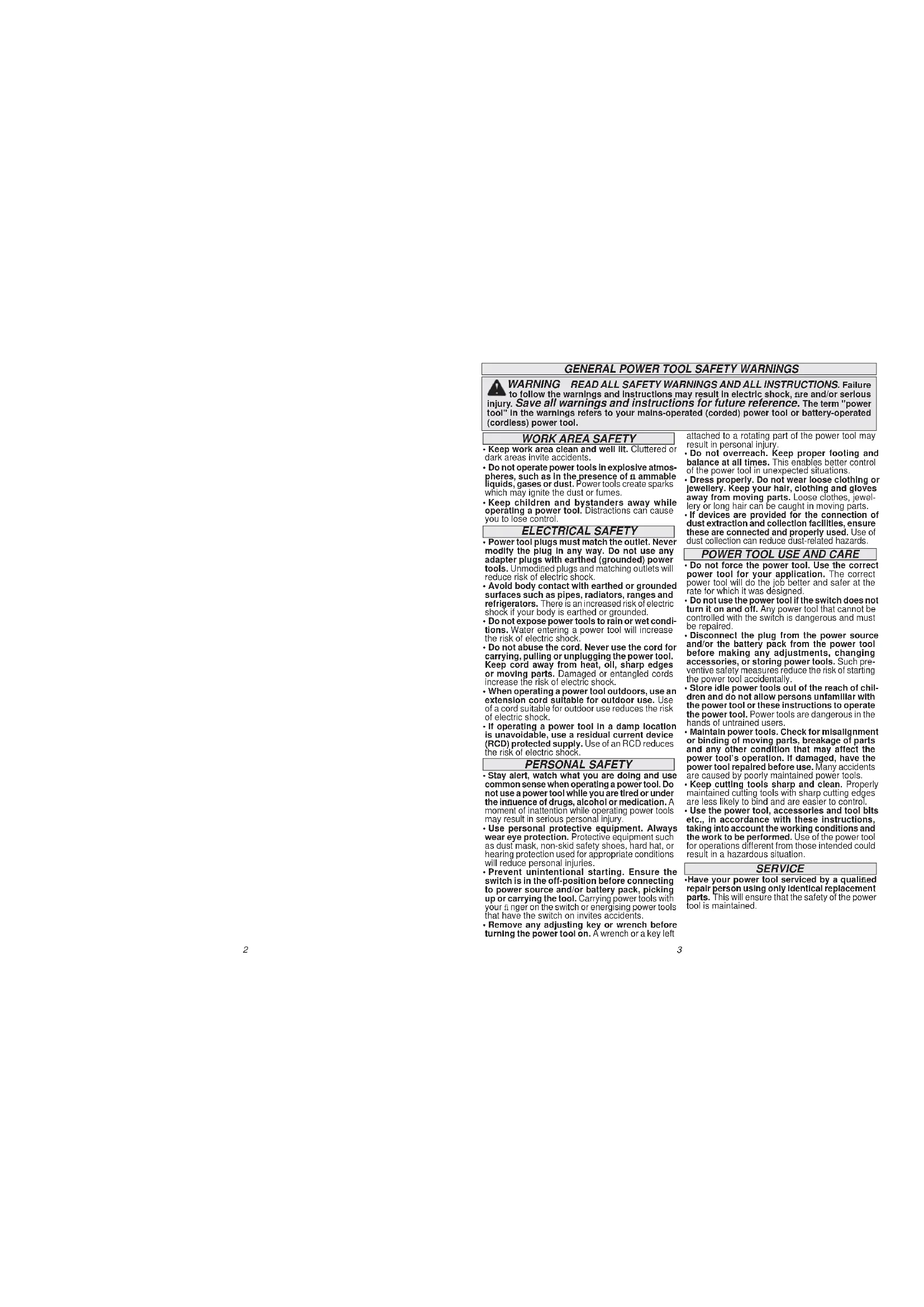 - If devices are provided for the connection of dust extraction and collection facilities, ensure these are connected and properly used. Use of dust collection can reduce dust-related hazards. WARNING READ ALL SAFETY WARNINGS AND ALL INSTRUCTIONS. Failure to follow the warnings and instructions may result in electric shock, fi re and/or serious injury. Save all warnings and instructions for future reference. The term "power tool" in the warnings refers to your mains-operated (corded) power tool or battery-operated (cordless) power tool.