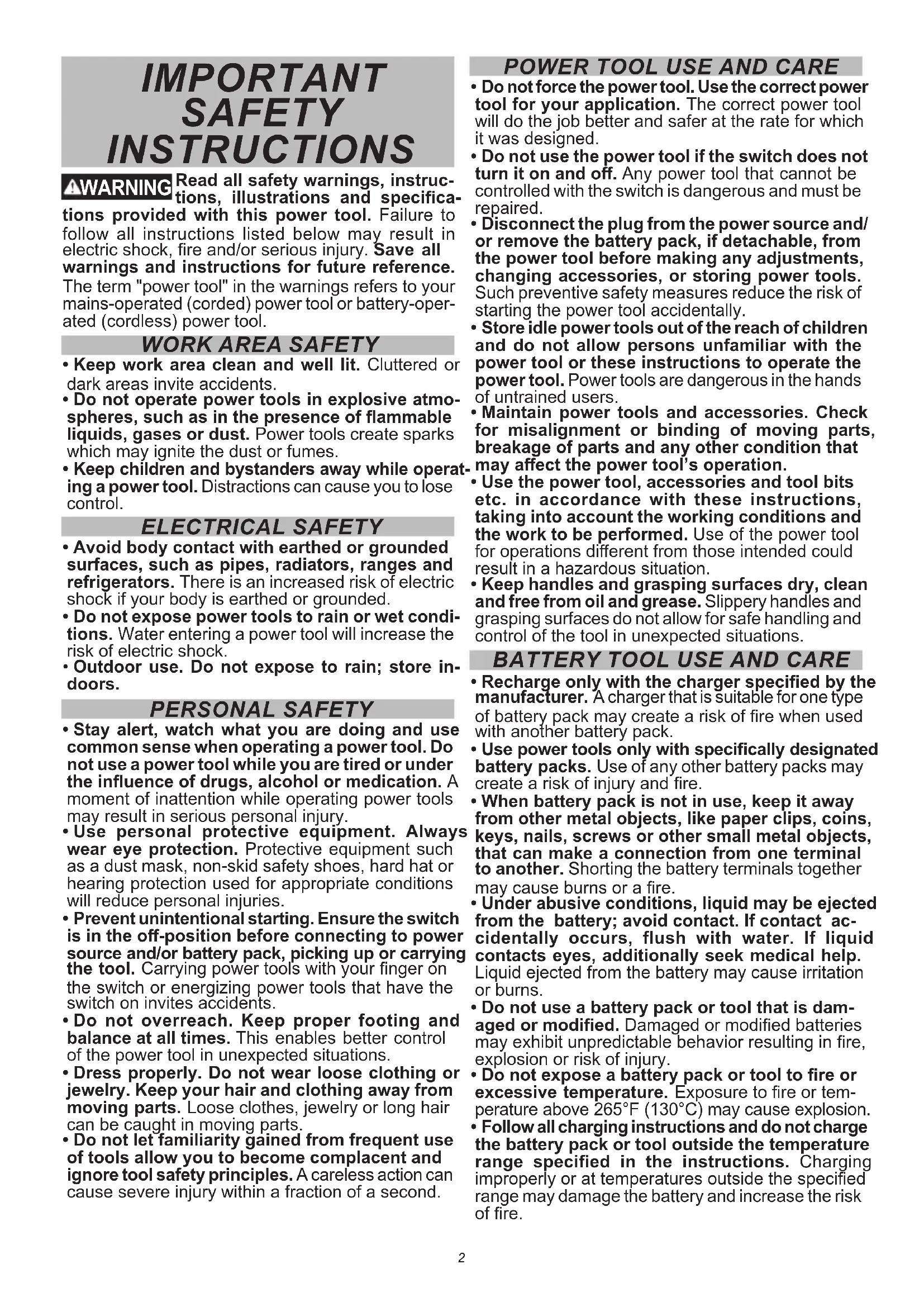 tions provided with this power tool. Failure to follow all instructions listed below may result in electric shock, fire and/or serious injury. Save all warnings and instructions for future reference.
