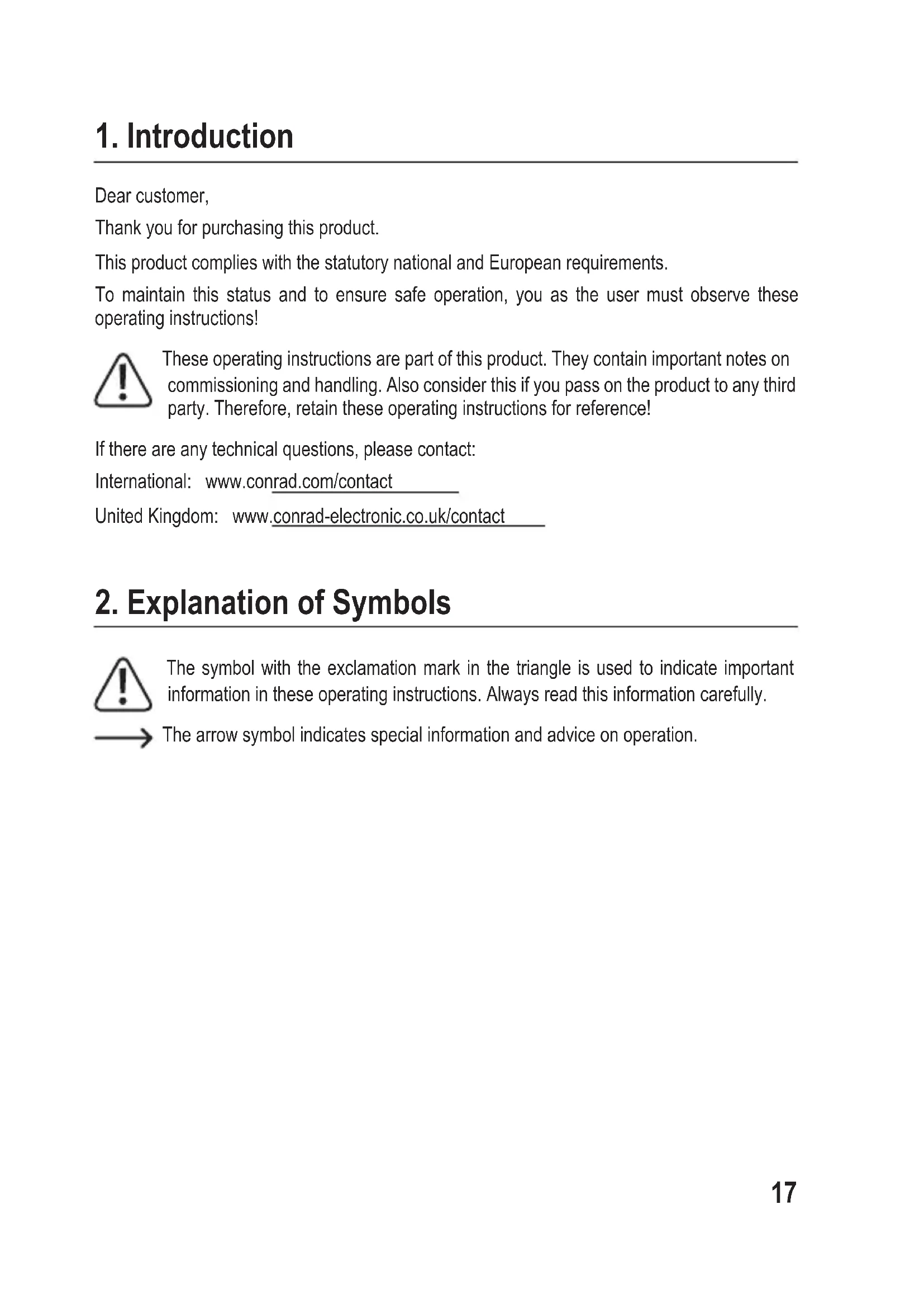 Dear customer, Thank you for purchasing this product. This product complies with the statutory national and European requirements. To maintain this status and to ensure safe operation, you as the user must observe these operating instructions! These operating instructions are part of this product. They contain important notes on commissioning and handling. Also consider this if you pass on the product to any third party. Therefore, retain these operating instructions for reference! If there are any technical questions, please contact: International: www.conrad.com/contact United Kingdom: www.conrad-electronic.co.uk/contact