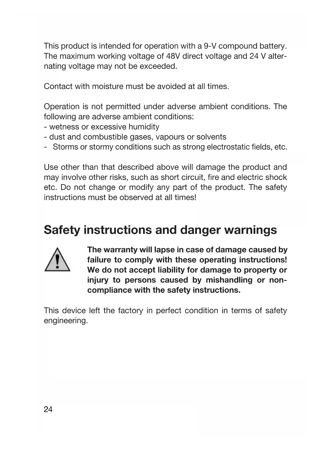 Storms or stormy conditions such as strong electrostatic fields, etc. Use other than that described above will damage the product and may involve other risks, such as short circuit, fire and electric shock etc. Do not change or modify any part of the product. The safety instructions must be observed at all times! Safety instructions and danger warnings The warranty will lapse in case of damage caused by failure to comply with these operating instructions! We do not accept liability for damage to property or injury to persons caused by mishandling or non- compliance with the safety instructions. This device left the factory in perfect condition in terms of safety engineering. 24To maintain this status and ensure safe operation, the user must observe the safety instructions and warnings ("Caution!” and "Note!”) contained in these instructions for use. The following sym- bols and notices must be observed: Note! Read the instructions for use. This product has been CE-tested and meets the neces- sary guidelines.