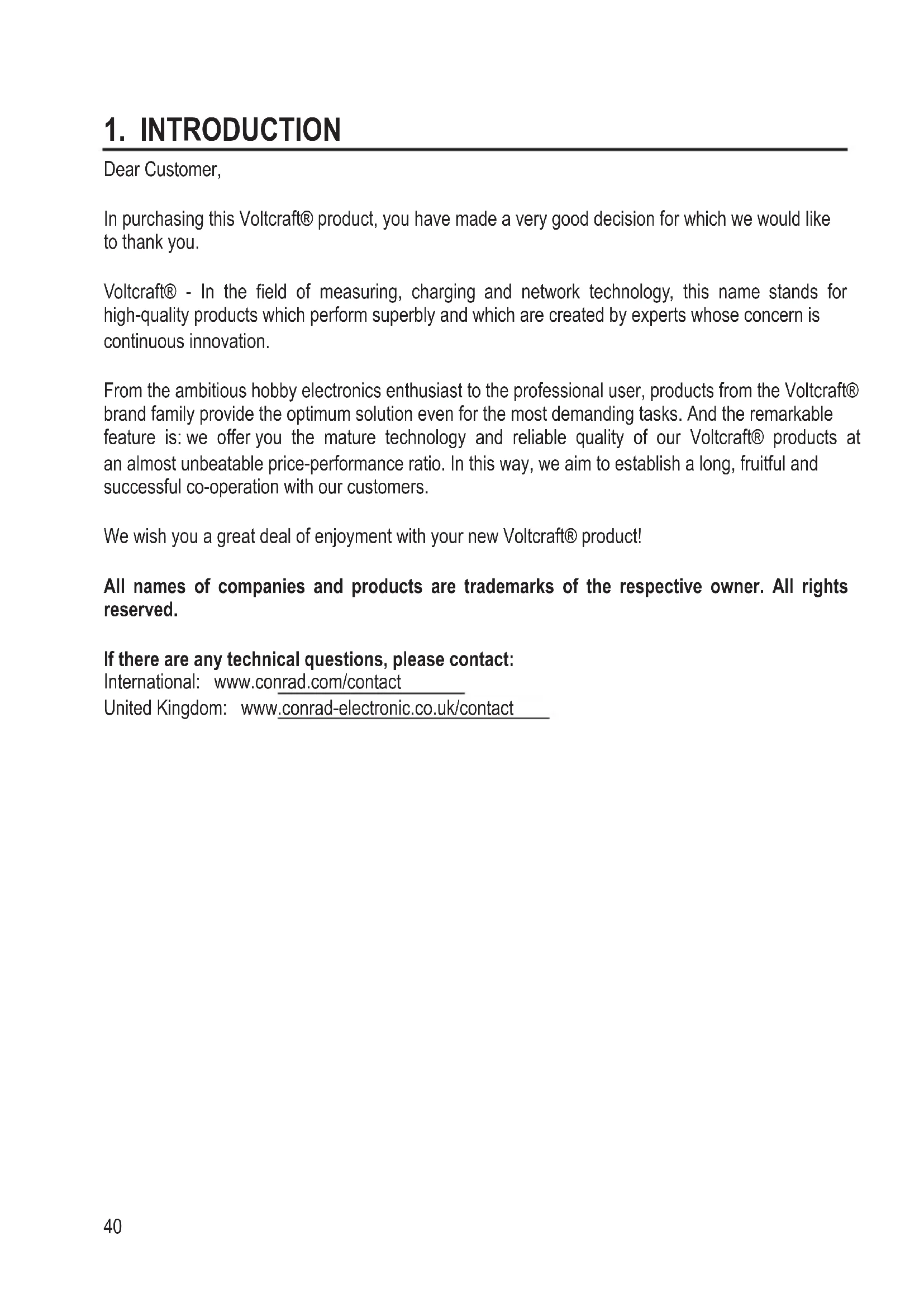 Dear Customer, In purchasing this Voltcraft® product, you have made a very good decision for which we would like to thank you. Voltcraft® - In the eld of measuring, charging and network technology, this name stands for high-quality products which perform superbly and which are created by experts whose concern is continuous innovation. From the ambitious hobby electronics enthusiast to the professional user, products from the Voltcraft® brand family provide the optimum solution even for the most demanding tasks. And the remarkable feature is: we offer you the mature technology and reliable quality of our Voltcraft® products at an almost unbeatable price-performance ratio. In this way, we aim to establish a long, fruitful and successful co-operation with our customers. We wish you a great deal of enjoyment with your new Voltcraft® product! All names of companies and products are trademarks of the respective owner. All rights reserved. If there are any technical questions, please contact: International: www.conrad.com/contact United Kingdom: www.conrad-electronic.co.uk/contact41