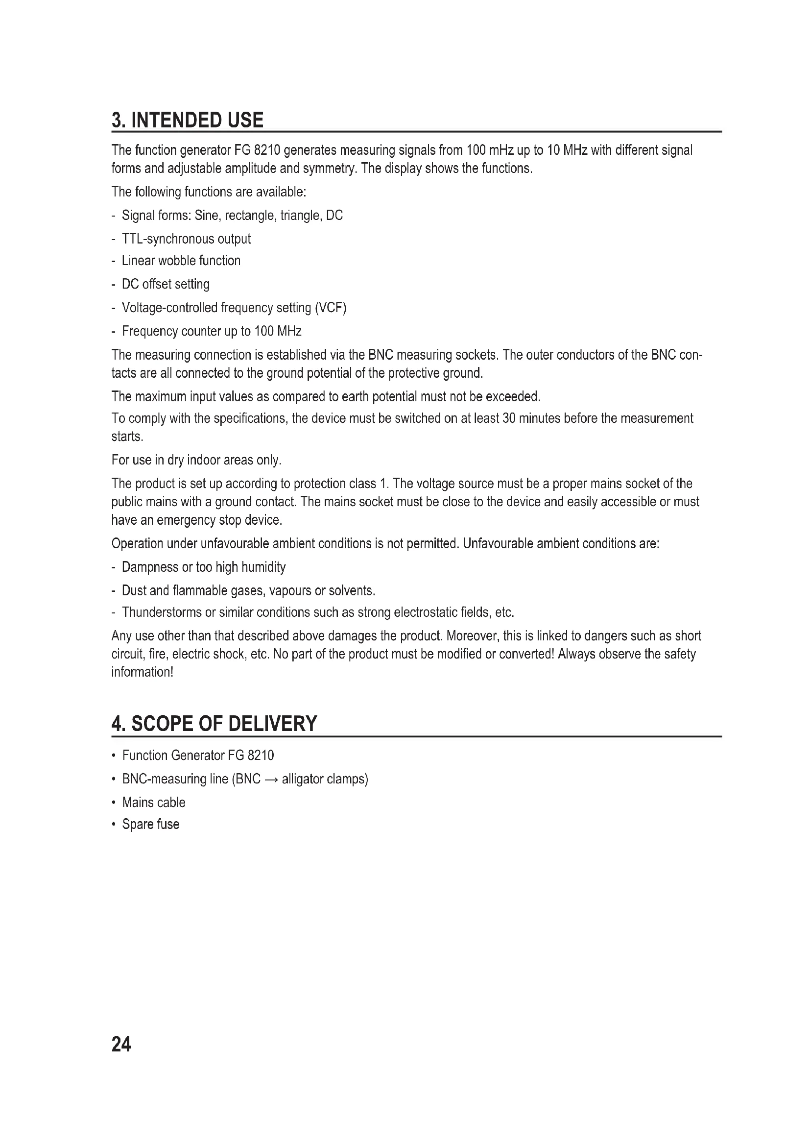 The function generator FG 8210 generates measuring signals from 100 mHz up to 10 MHz with different signal forms and adjustable amplitude and symmetry. The display shows the functions. The following functions are available: - Signal forms: Sine, rectangle, triangle, DC - TTL-synchronous output - Linear wobble function - DC offset setting - Voltage-controlled frequency setting (VCF) - Frequency counter up to 100 MHz The measuring connection is established via the BNC measuring sockets. The outer conductors of the BNC con- tacts are all connected to the ground potential of the protective ground. The maximum input values as compared to earth potential must not be exceeded. To comply with the specications, the device must be switched on at least 30 minutes before the measurement starts. For use in dry indoor areas only. The product is set up according to protection class 1. The voltage source must be a proper mains socket of the public mains with a ground contact. The mains socket must be close to the device and easily accessible or must have an emergency stop device. Operation under unfavourable ambient conditions is not permitted. Unfavourable ambient conditions are: - Dampness or too high humidity - Dust and ammable gases, vapours or solvents. - Thunderstorms or similar conditions such as strong electrostatic elds, etc. Any use other than that described above damages the product. Moreover, this is linked to dangers such as short circuit, re, electric shock, etc. No part of the product must be modied or converted! Always observe the safety information!