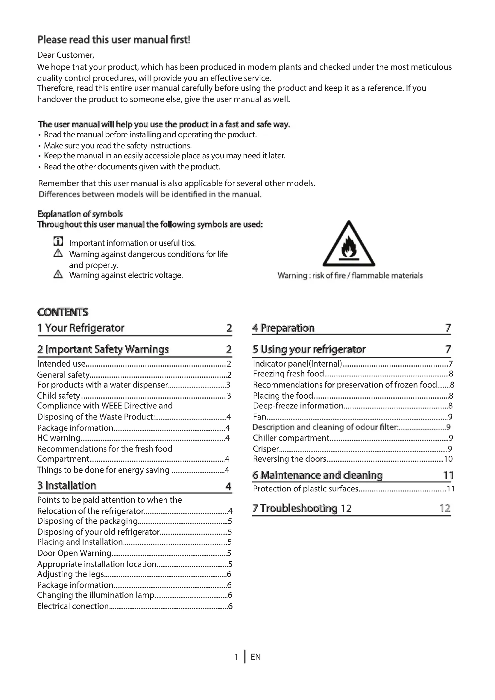 - Read the other documents given with the product. Remember that this user manual is also applicable for several other models. Explanation of symbols Throughout this user manual the following symbols are used: Important information or useful tips. Warning against dangerous conditions for life and property. Warning against electric voltage. 1 Your Refrigerator