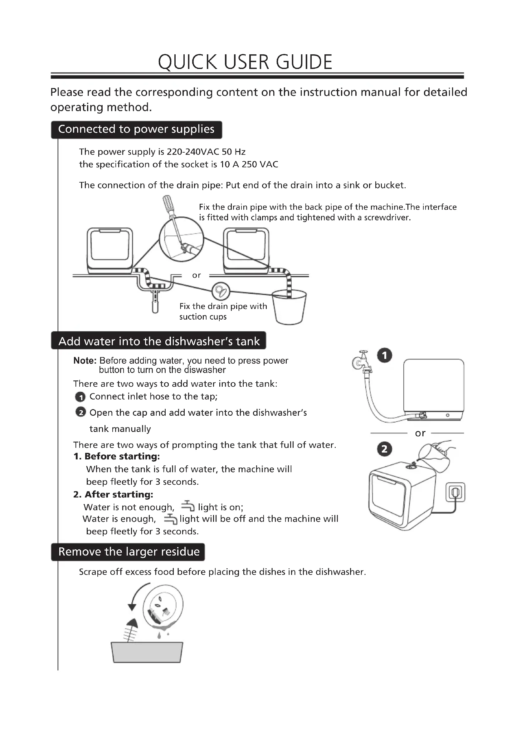 Water is not enough, light is on; Water is enough, light will be off and the machine will beep fleetly for 3 seconds. Remove the larger residue Scrape off excess food before placing the dishes in the dishwasher. The power supply is 220-240VAC 50 Hz the specification of the socket is 10 A 250 VAC There are two ways to add water into the tank: