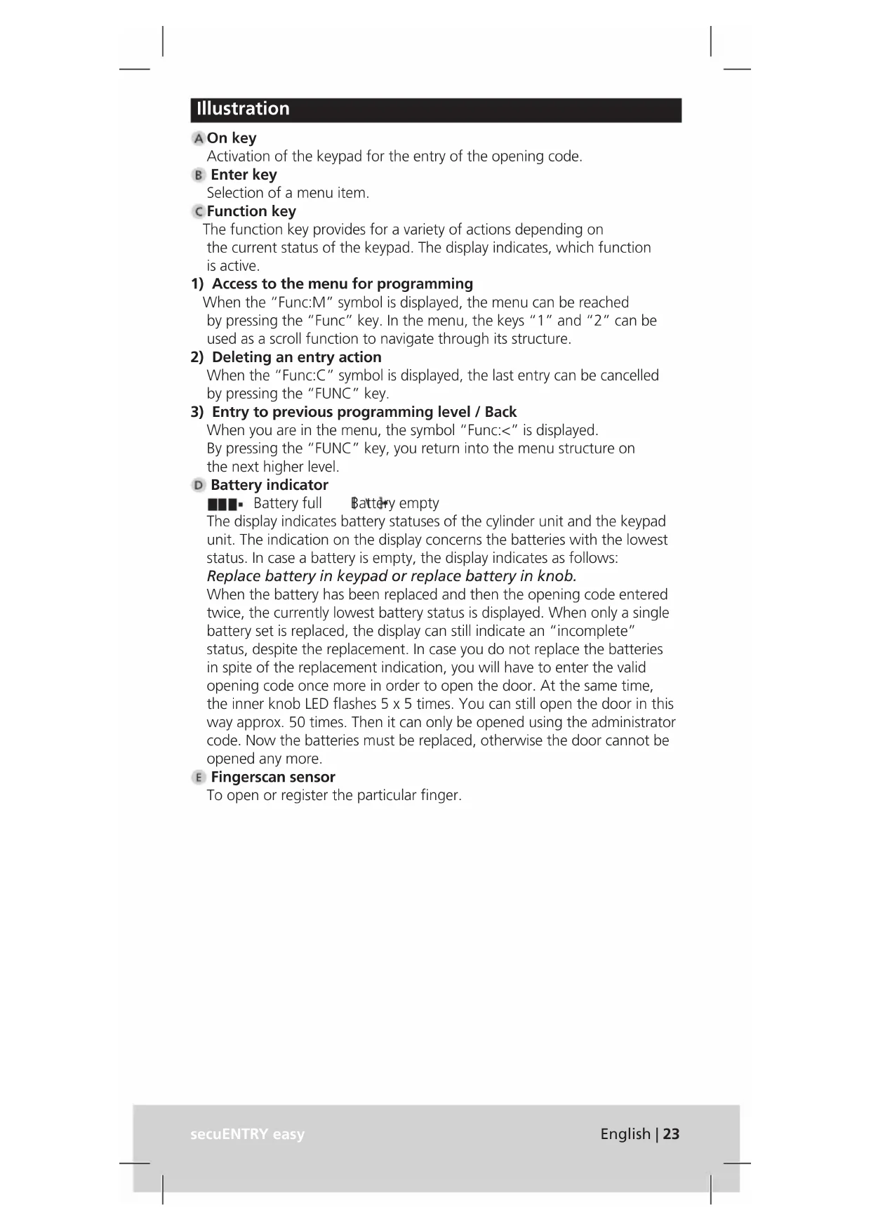 When you are in the menu, the symbol “Func:<” is displayed. By pressing the “FUNC” key, you return into the menu structure on the next higher level. Battery indicator Battery full Battery empty The display indicates battery statuses of the cylinder unit and the keypad unit. The indication on the display concerns the batteries with the lowest status. In case a battery is empty, the display indicates as follows: Replace battery in keypad or replace battery in knob. When the battery has been replaced and then the opening code entered twice, the currently lowest battery status is displayed. When only a single battery set is replaced, the display can still indicate an “incomplete” status, despite the replacement. In case you do not replace the batteries in spite of the replacement indication, you will have to enter the valid opening code once more in order to open the door. At the same time, the inner knob LED ashes 5 x 5 times. You can still open the door in this way approx. 50 times. Then it can only be opened using the administrator code. Now the batteries must be replaced, otherwise the door cannot be opened any more. Fingerscan sensor To open or register the particular nger.24 | English secuENTRY easy Dear customer, Thank you very much for your decision for the secuENTRY electronic lock system manufactured by BURG-WÄCHTER. This system has been developed and manufactured using the latest technical potential and satises high security requirements. The electronic cylinder can be used easily without any drilling in any door prepared for prole cylinder up to a door thickness of 118 mm (59 / 59, measured at the central detent bolt), and is perfectly appropriate for new installation as well as for retrotting. Depending on the specic system, various opening media are available. With systems containing a keypad, user administration is additionally integrated. You can nd out more on the following pages. Remove the battery protection strip from the inner knob in order to energise the cylinder. Important: Please read the entire User Manual before you start programming. We hope you enjoy your new locking system. General information about secuENTRY easy secuENTRY is available in two equipment congurations: