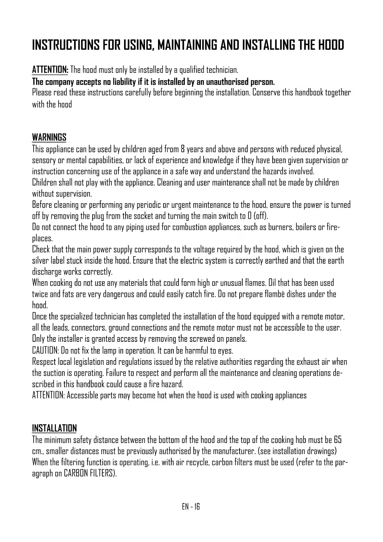 INSTALLATION The minimum safety distance between the bottom of the hood and the top of the cooking hob must be 65 cm., smaller distances must be previously authorised by the manufacturer. (see installation drawings) When the filtering function is operating, i.e. with air recycle, carbon filters must be used (refer to the par- agraph on CARBON FILTERS).EN - 17 ASSEMBLY INSTRUCTIONS Attention: Before proceeding with the installation, make sure that the screws and the anchors al- ready supplied, are suitable for the type of wall the hood must be fixed to. To assemble the hood use the accessories that are supplied and follow the instructions given in the en- closed handbook.
