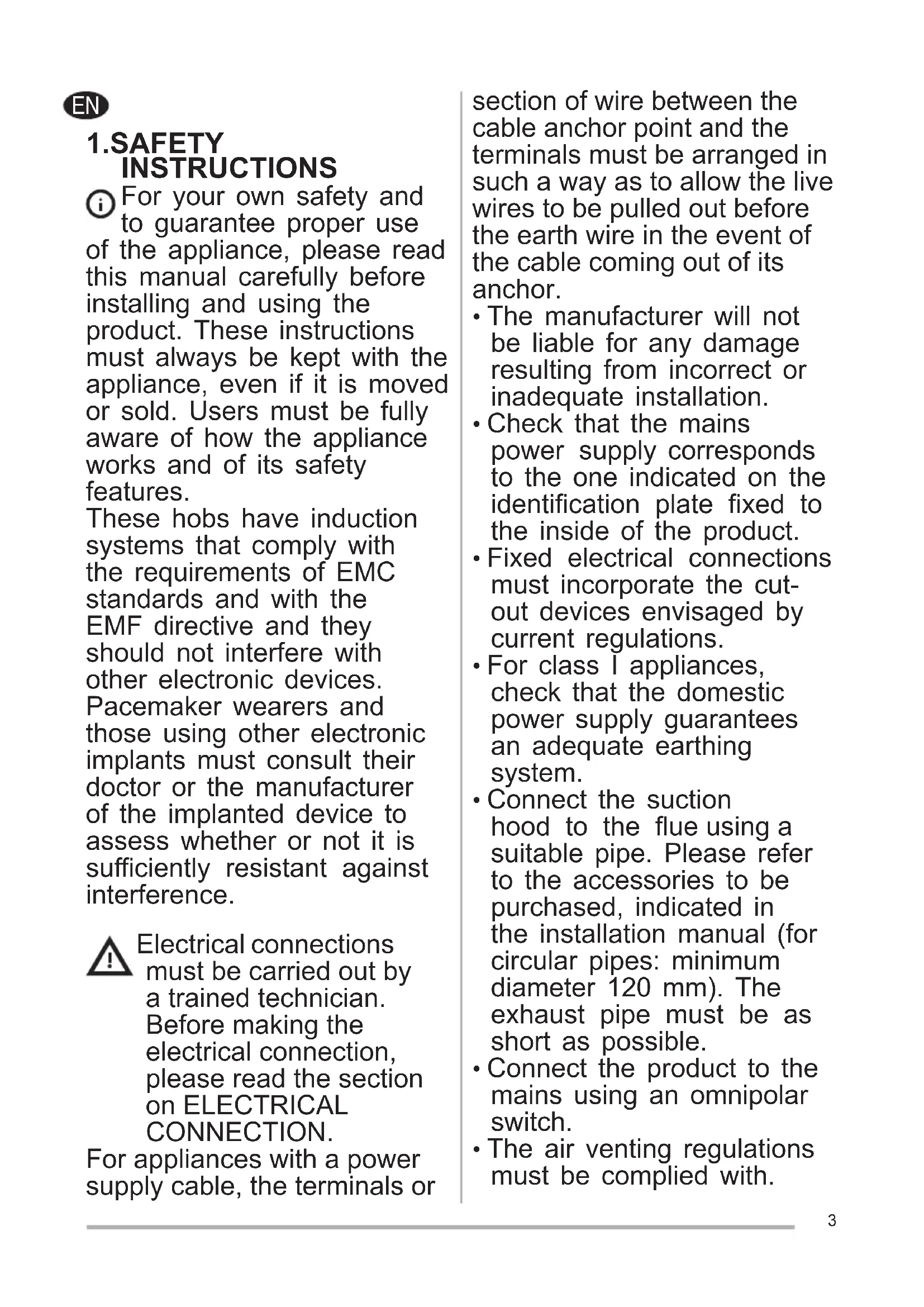 INSTRUCTIONS For your own safety and to guarantee proper use of the appliance, please read this manual carefully before installing and using the product. These instructions must always be kept with the appliance, even if it is moved or sold. Users must be fully aware of how the appliance works and of its safety features. These hobs have induction systems that comply with the requirements of EMC standards and with the EMF directive and they should not interfere with other electronic devices. Pacemaker wearers and those using other electronic implants must consult their doctor or the manufacturer of the implanted device to assess whether or not it is suciently resistant against interference. Electrical connections must be carried out by a trained technician. Before making the electrical connection, please read the section on ELECTRICAL CONNECTION. For appliances with a power supply cable, the terminals or section of wire between the cable anchor point and the terminals must be arranged in such a way as to allow the live wires to be pulled out before the earth wire in the event of the cable coming out of its anchor.