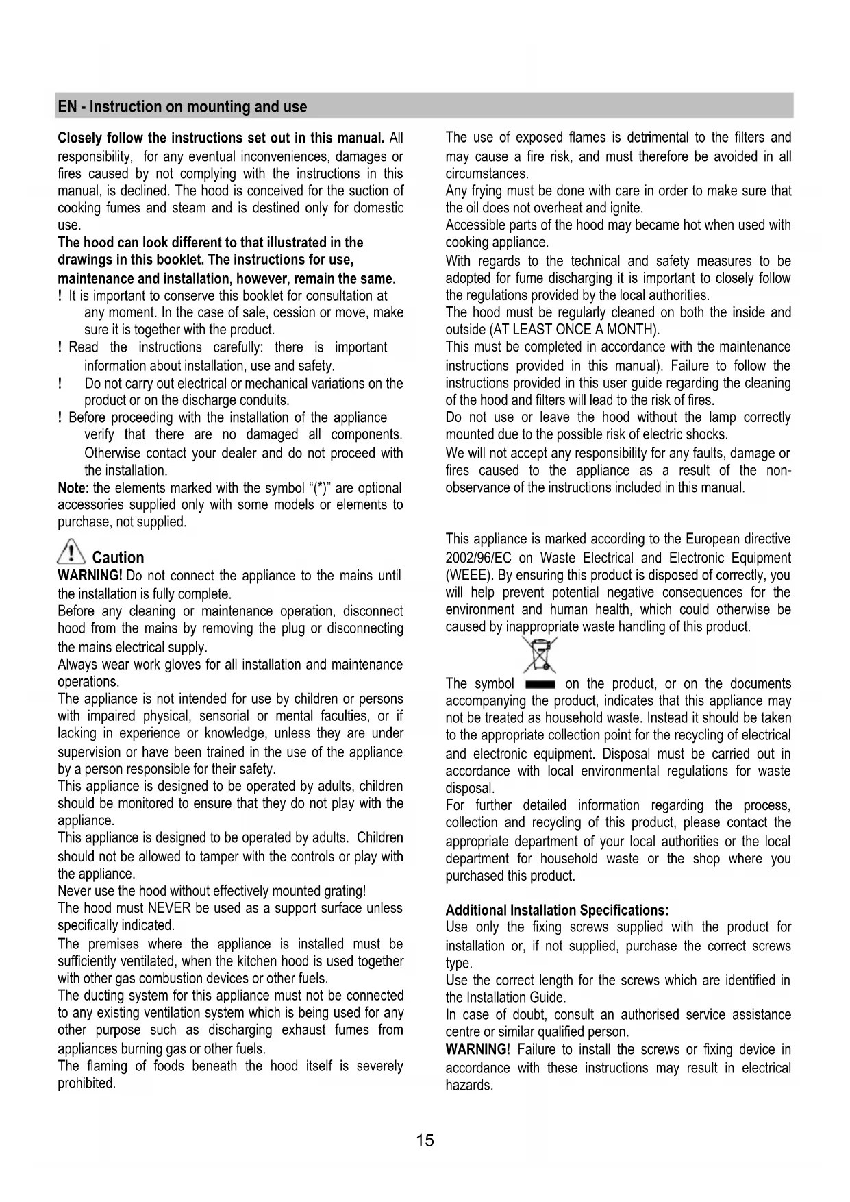 This appliance is marked according to the European directive 2002/96/EC on Waste Electrical and Electronic Equipment (WEEE). By ensuring this product is disposed of correctly, you will help prevent potential negative consequences for the environment and human health, which could otherwise be caused by inappropriate waste handling of this product. The symbol on the product, or on the documents accompanying the product, indicates that this appliance may not be treated as household waste. Instead it should be taken to the appropriate collection point for the recycling of electrical and electronic equipment. Disposal must be carried out in accordance with local environmental regulations for waste disposal. For further detailed information regarding the process, collection and recycling of this product, please contact the appropriate department of your local authorities or the local department for household waste or the shop where you purchased this product. Additional Installation Specifications: Use only the fixing screws supplied with the product for installation or, if not supplied, purchase the correct screws type. Use the correct length for the screws which are identified in the Installation Guide. In case of doubt, consult an authorised service assistance centre or similar qualified person. WARNING! Failure to install the screws or fixing device in accordance with these instructions may result in electrical hazards.16 Use The hood is designed to be used either for exhausting or filter version. Ducting version In this case the fumes are conveyed outside of the building by means of a special pipe connected with the connection ring located on top of the hood. Attention! The exhausting pipe is not supplied and must be purchased apart. Diameter of the exhausting pipe must be equal to that of the connection ring. In the horizontal runs the exhausting pipe must be slightly slanted (about 10°) and directed upwards to vent the air easily from the room to the outside. Attention! If the hood is supplied with active charcoal filter, then it must be removed. Connect the hood and discharge holes on the walls with a diameter equivalent to the air outlet (connection flange). Using the tubes and discharge holes on walls with smaller dimensions will cause a diminution of the suction performance and a drastic increase in noise. Any responsibility in the matter is therefore declined. ! Use a duct of the minimum indispensible length. ! Use a duct with as few elbows as possible (maximum elbow angle: 90°). ! Avoid drastic changes in the duct cross-section. ! Use a duct as smooth as possible inside. ! The duct must be made of certified material. Filter version One active charcoal filter is needed for this and can be obtained from your usual retailer. The filter removes the grease and smells from the extracted air before sending it back into the room through the upper outlet grid. Installation The minimum distance between the supporting surface for the cooking equipment on the hob and the lowest part of the range hood must be not less than 50cm from electric cookers and 50cm from gas or mixed cookers. If the instructions for installation for the gas hob specify a greater distance, this must be adhered to. Electrical connection The mains power supply must correspond to the rating indicated on the plate situated inside the hood. If provided with a plug connect the hood to a socket in compliance with current regulations and positioned in an accessible area, after installation. If it not fitted with a plug (direct mains connection) or if the plug is not located in an accessible area, after installation, apply a double pole switch in accordance with standards which assures the complete disconnection of the mains under conditions relating to over-current category III, in accordance with installation instructions. Warning! Before re-connecting the hood circuit to the mains supply and checking the efficient function, always check that the mains cable is correctly assembled. Warning! Power cable replacement must be undertaken by the authorised service assistance centre or similar qualified person. Mounting Before beginning installation: