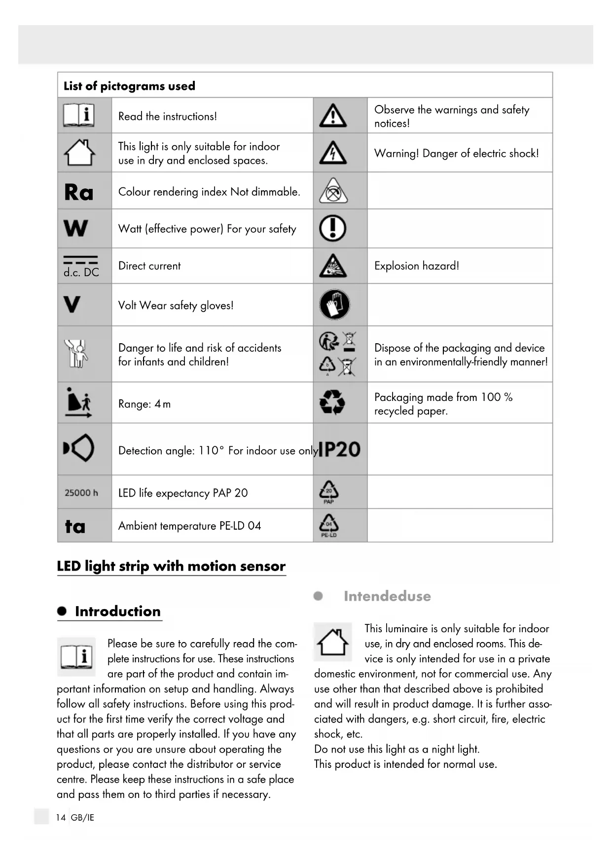 Ambient temperature PE-LD 04 LED light strip with motion sensor Introduction Please be sure to carefully read the com- plete instructions for use. These instructions are part of the product and contain im- portant information on setup and handling. Always follow all safety instructions. Before using this prod- uct for the first time verify the correct voltage and that all parts are properly installed. If you have any questions or you are unsure about operating the product, please contact the distributor or service centre. Please keep these instructions in a safe place and pass them on to third parties if necessary. Intended use This luminaire is only suitable for indoor use, in dry and enclosed rooms. This de- vice is only intended for use in a private domestic environment, not for commercial use. Any use other than that described above is prohibited and will result in product damage. It is further asso- ciated with dangers, e.g. short circuit, fire, electric shock, etc. Do not use this light as a night light. This product is intended for normal use.15 GB/IE Introduction / SafetyIntroduction Scope of delivery Check immediately after unpacking that the parts are complete and that the product is in proper condition. 1 LED rope light 1 adhesive strip 4 batteries 1.5 V AAA 1 set of assembly instructions and instructions for use Parts description