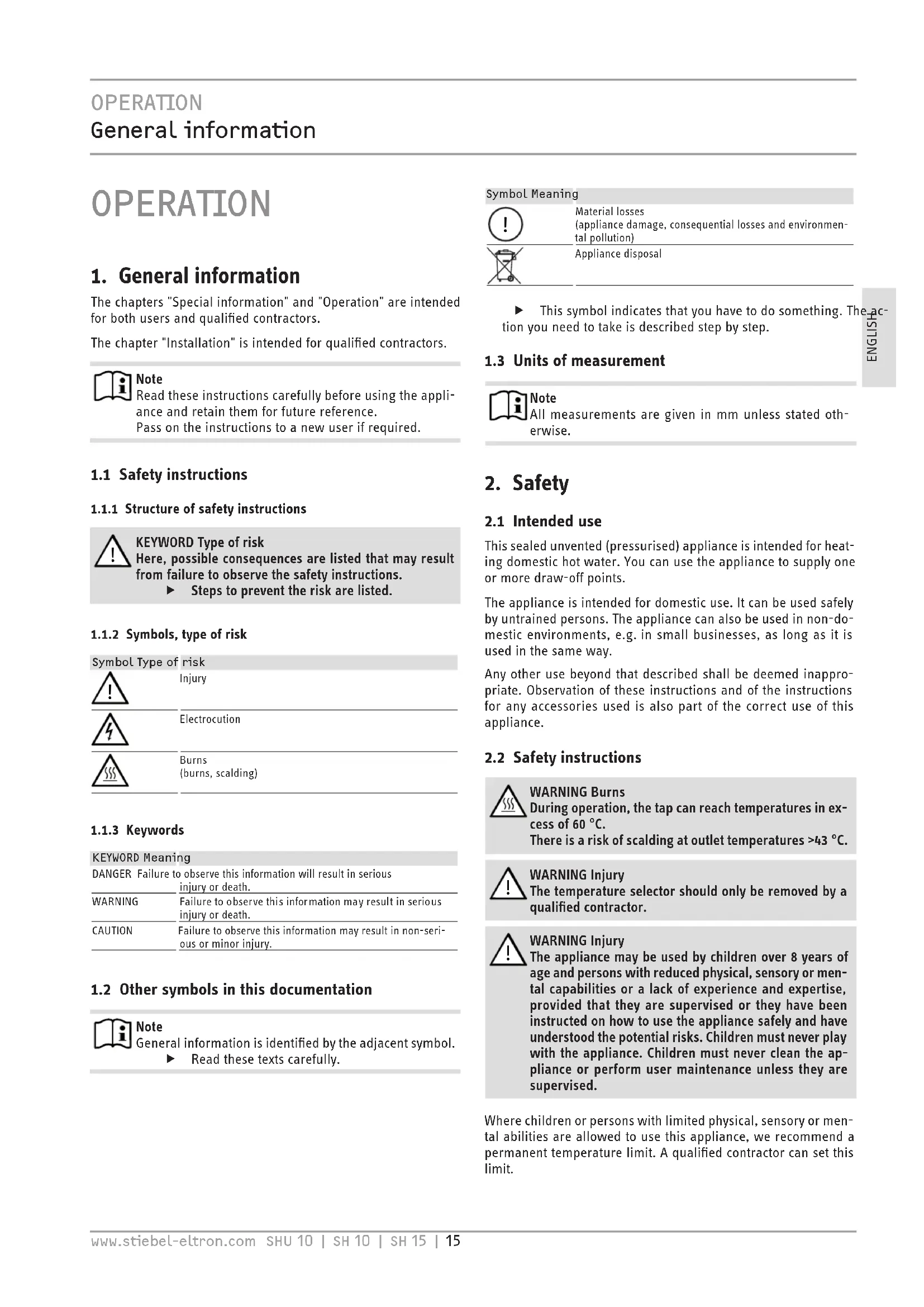 SPECIAL INFORMATION - The appliance may be used by children aged8 and older and persons with reduced physical, sensory or mental capabilities or a lack of ex- perience and know-how, provided that they are supervised or they have been instructed on how to use the appliance safely and have understood the potential risks. Children must never play with the appliance. Children must never clean the ap- pliance or perform user maintenance unless they are supervised. - When permanently connected to the power sup- ply using a dedicated junction box, the appliance must be able to be isolated from the mains power supply by an isolator that disconnects all poles with at least 3mm contact separation. - The power cable may only be replaced (for exam- ple if damaged) by a qualified contractor author- ised by the manufacturer, using an original spare part. - Secure the appliance as described in chapter "In- stallation/ Installation". - Observe the maximum permissible pressure (see chapter "Installation/ Specification/ Data table"). - Drain the appliance as described in chapter "In- stallation/ Maintenance/ Draining the appliance". - The appliance is pressurised. During the heat-up process, expansion water will drip from the safety valve. - Install the safety valve in the cold water supply line. - Regularly activate the safety valve to prevent it from becoming blocked, e.g. by limescale deposits. - Size the drain pipe so that water can drain off un- impeded when the safety valve is fully opened. - Fit the drain pipe of the safety valve with a con- stant downward slope and in a room free from the risk of frost. - The safety valve drain must remain open to the atmosphere.OPERATION General information www.stiebel-eltron.com SHU 10 | SH 10 | SH 15 | 15ENGLISH OPERATION