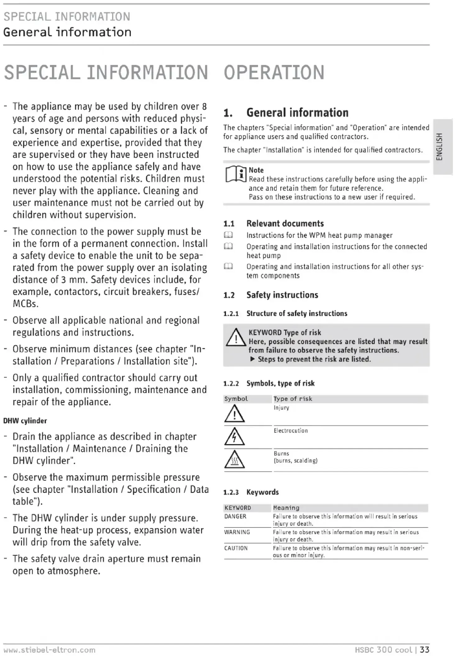 The chapters "Special information" and "Operation" are intended for appliance users and qualified contractors. The chapter "Installation" is intended for qualified contractors. Note Read these instructions carefully before using the appli¬ ance and retain them for future reference. Pass on these instructions to a new user if required. 1.1 Relevant documents O Instructions for the WPM heat pump manager O Operating and installation instructions for the connected heat pump O Operating and installation instructions for all other sys¬ tem components 1.2 Safety instructions 1.2.1 Structure of safety instructions KEYWORD Type of risk Here, possible consequences are listed that may result from failure to observe the safety instructions. ► Steps to prevent the risk are listed. 1.2.2 Symbols, type of risk Symbol Type of risk Injury Electrocution Burns (burns, scalding) 1.2.3 Keywords KEYWORD Meaning DANGER Failure to observe this information will result in serious injury or death. WARNING Failure to observe this information may result in serious injury or death. CAUTION Failure to observe this information may result in non-seri-ous or minor injury. www.stiebel-eltron.com HSBC 300 cool I 33 ENGLISHOPERATION Safety