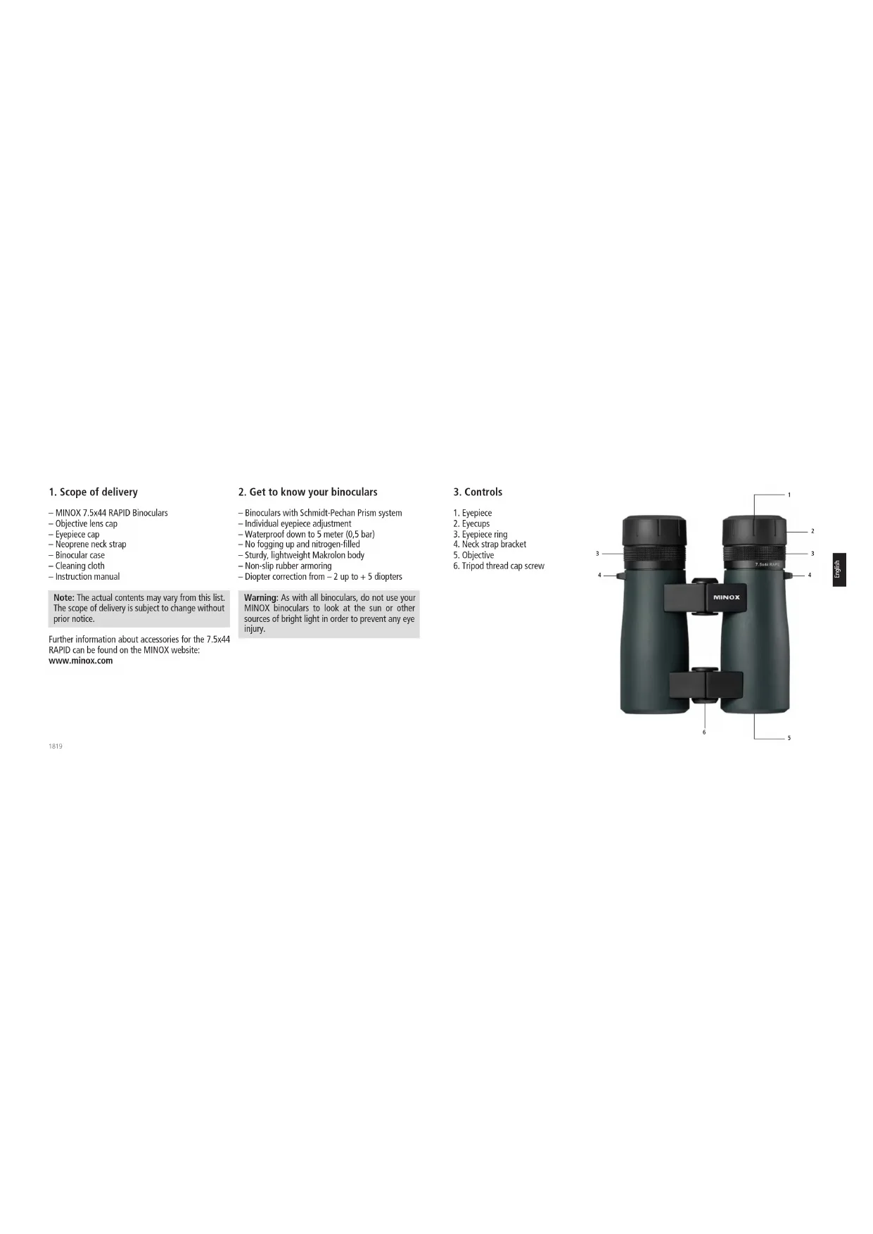 –MINOX 7.5x44 RAPID Binoculars –Objective lens cap –Eyepiece cap –Neoprene neck strap –Binocular case –Cleaning cloth –Instruction manual Note: The actual contents may vary from this list. The scope of delivery is subject to change without prior notice. Further information about accessories for the 7.5x44 RAPID can be found on the MINOX website: www.minox.com